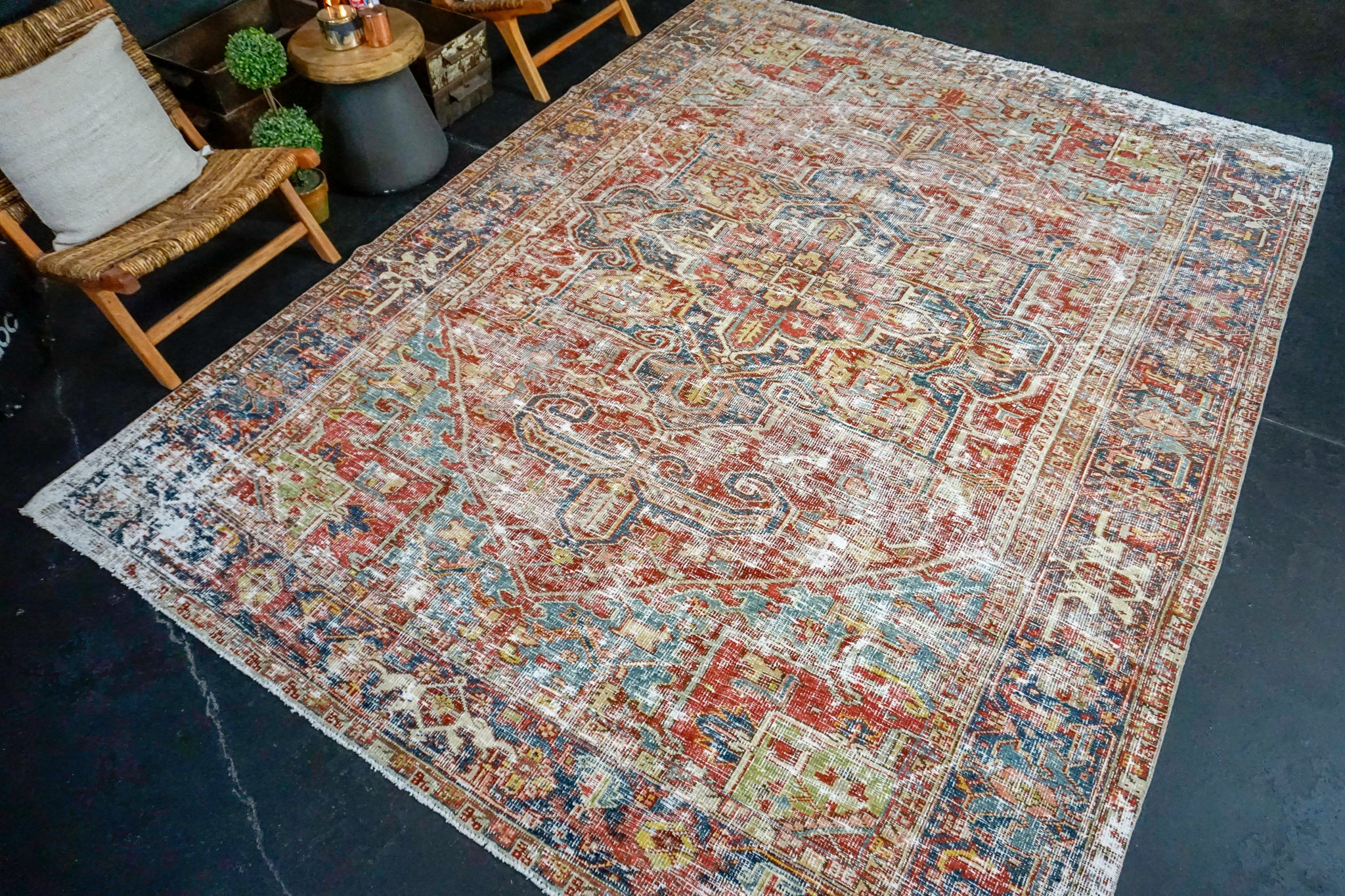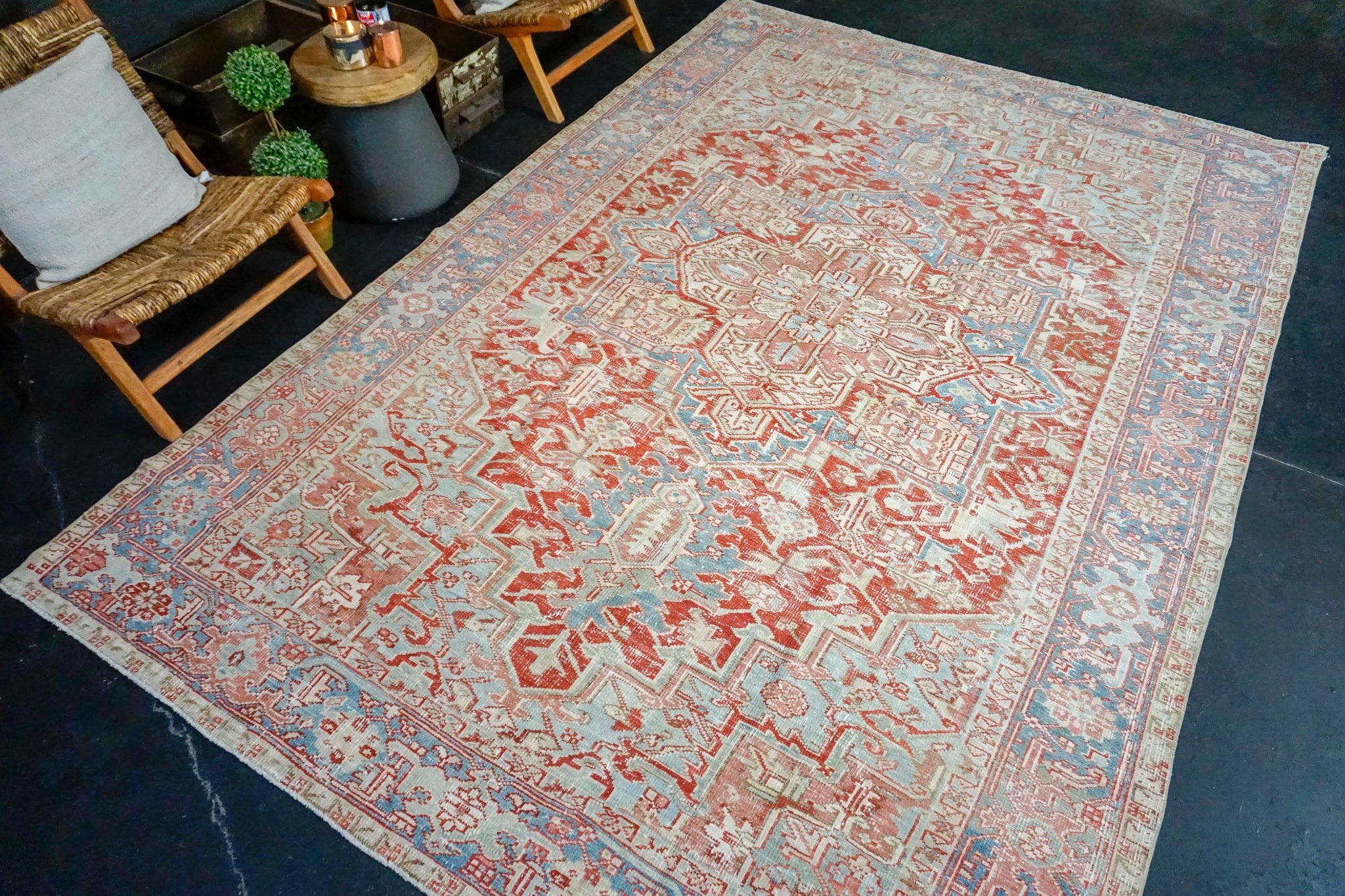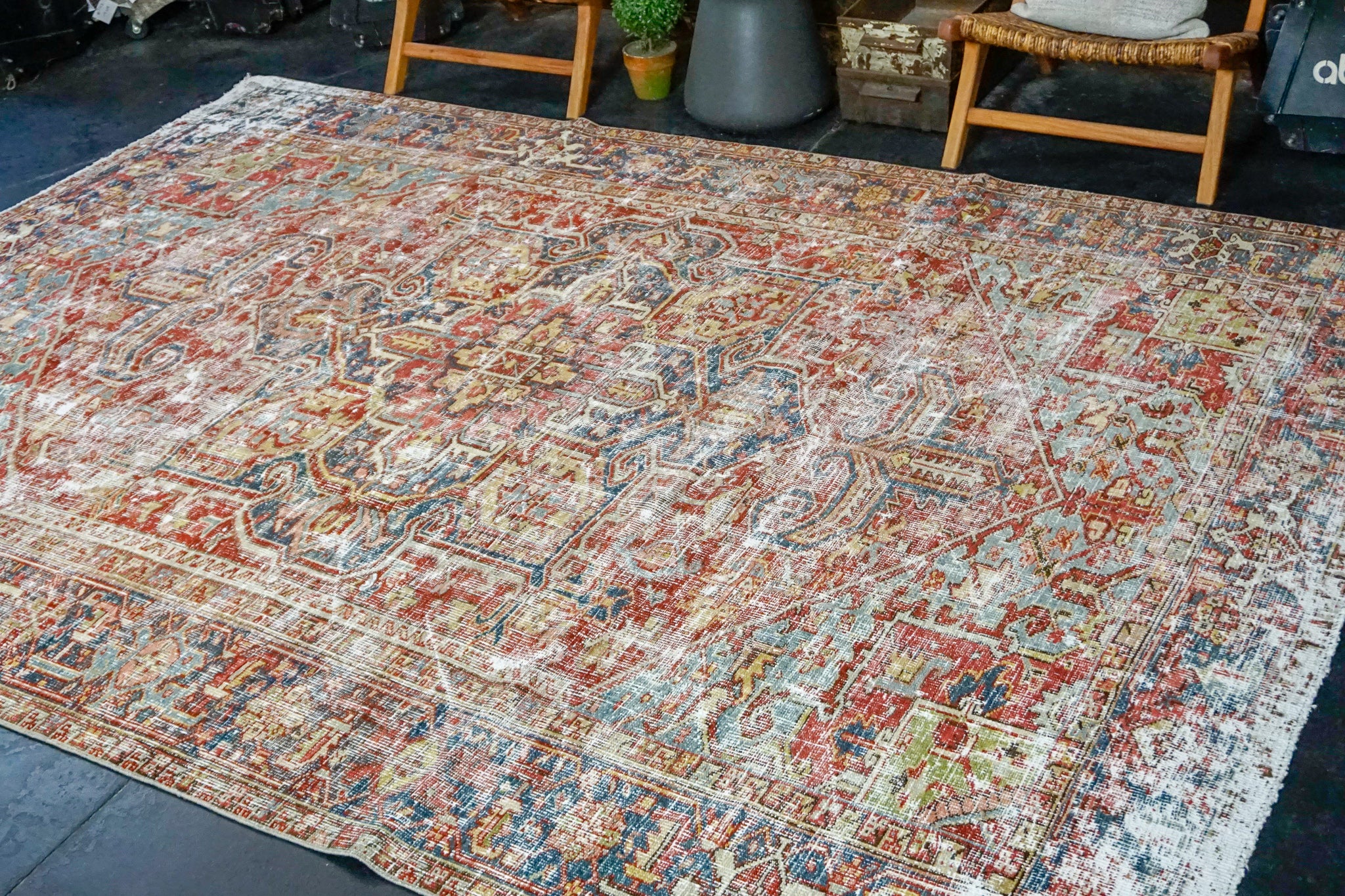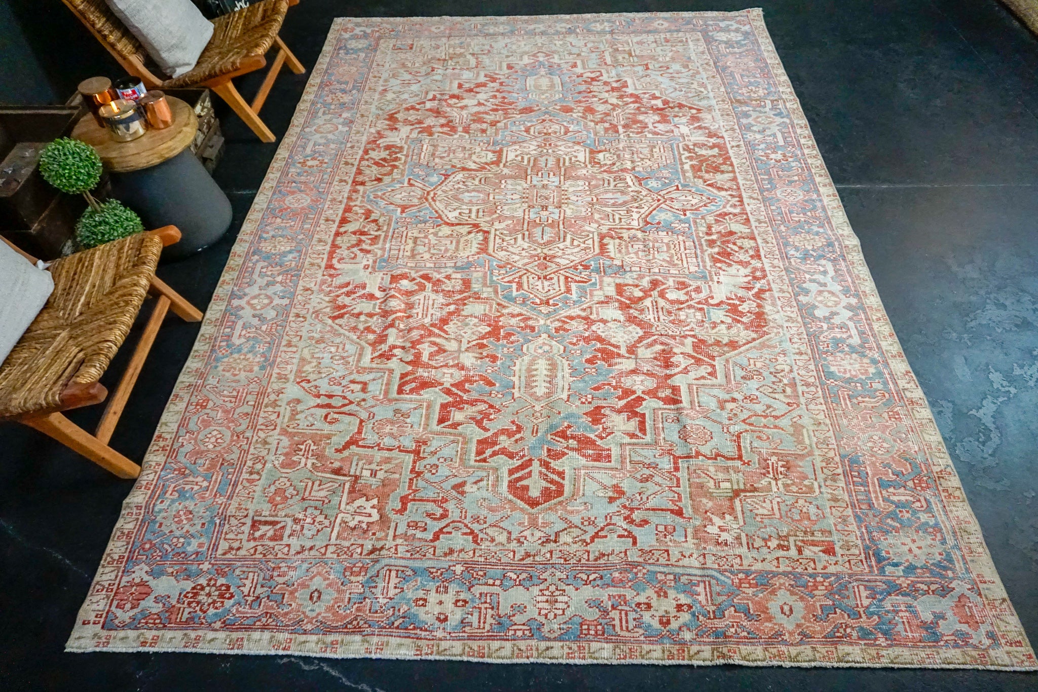 7’8 x 11’2 Classic Vintage Heriz Rug Muted Red, Blue and Creamy Ecru 60’s Carpet '3804