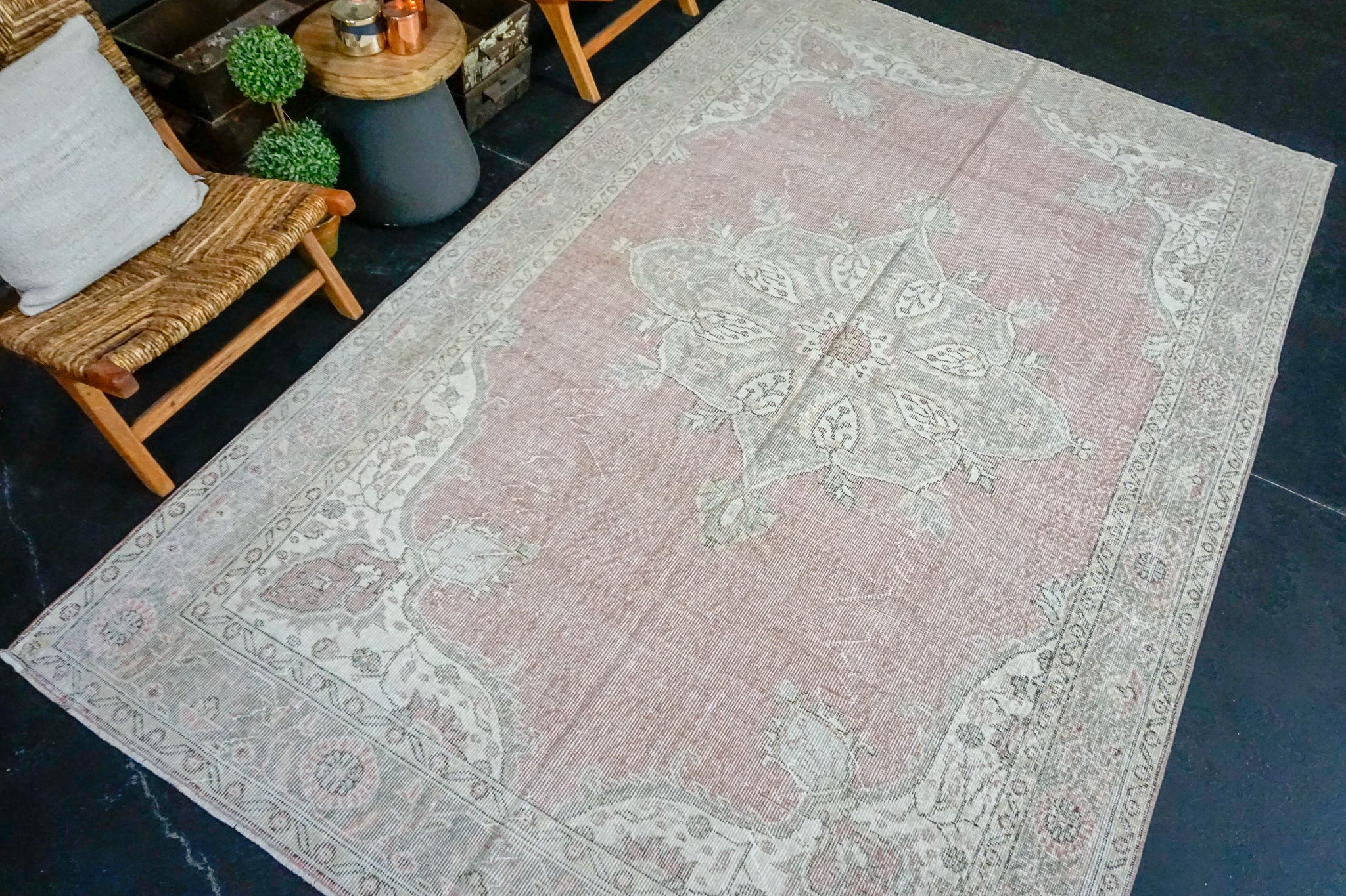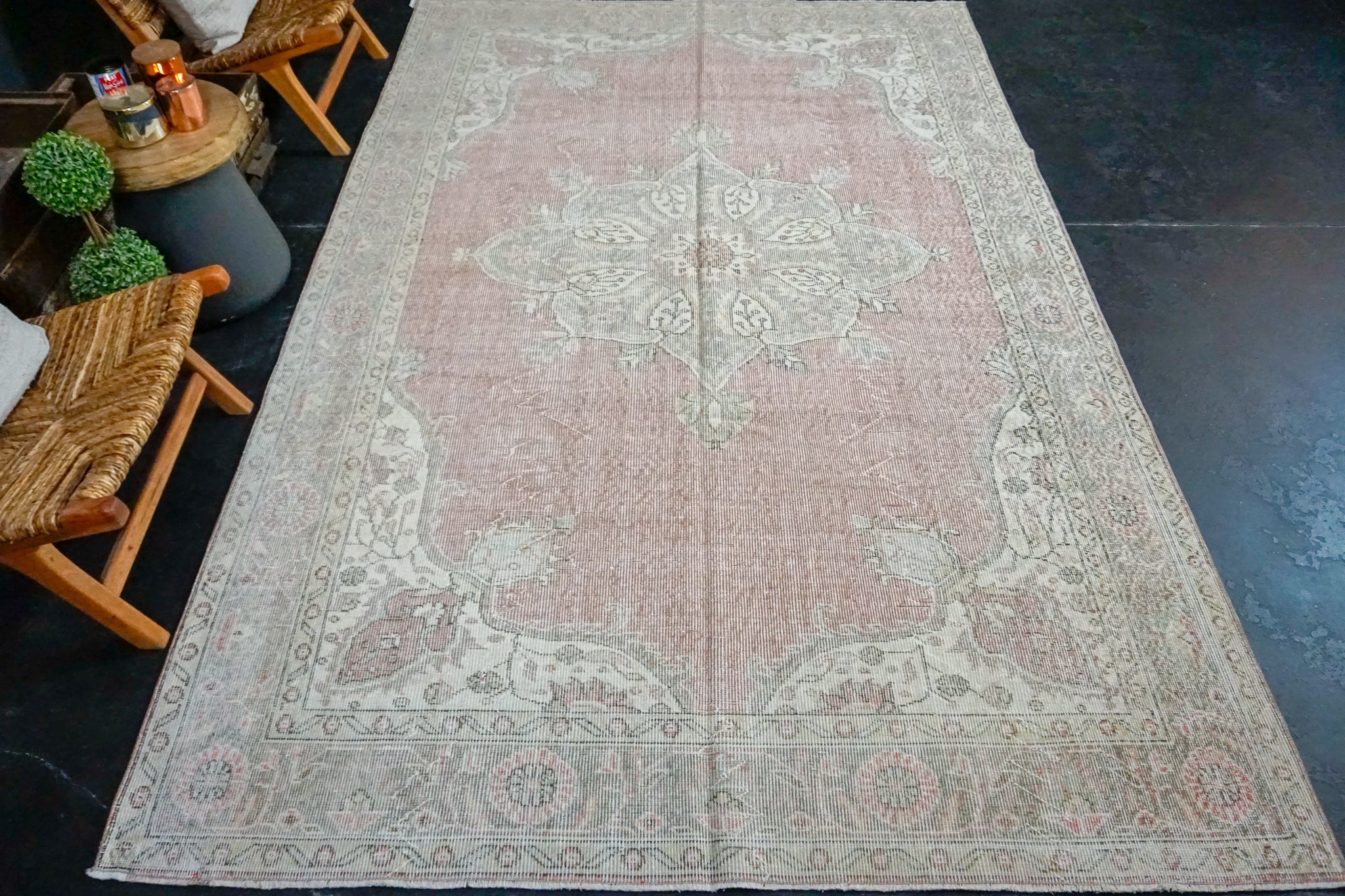 6’6 x 10’3 Vintage Oushak Rug Muted Pink, Gray and Cream Beige Carpet '3640