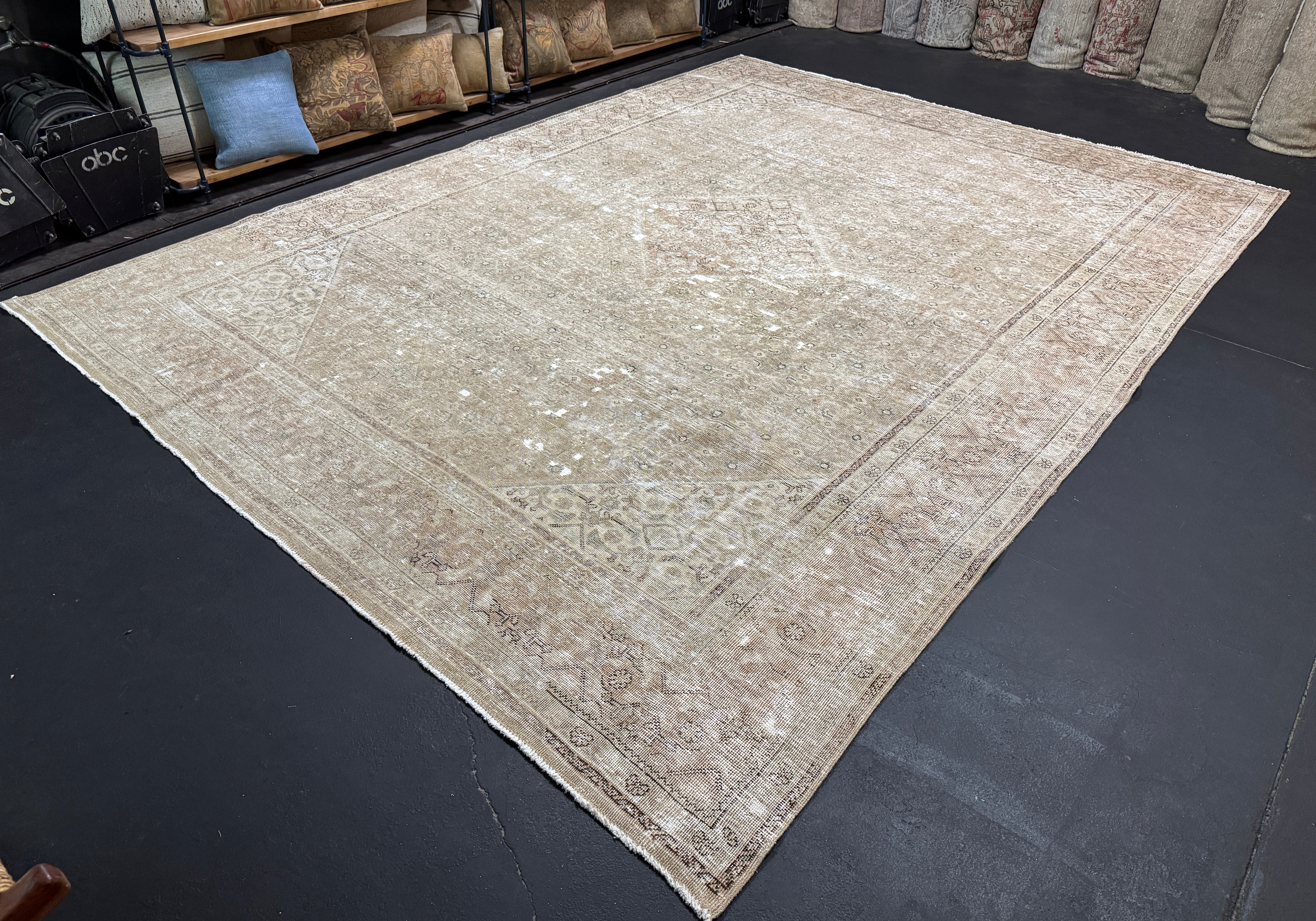 9’8 x 12’8 Classic Vintage Rug Muted Camel Beige, Sea Foam Green & Denim Blue '5433