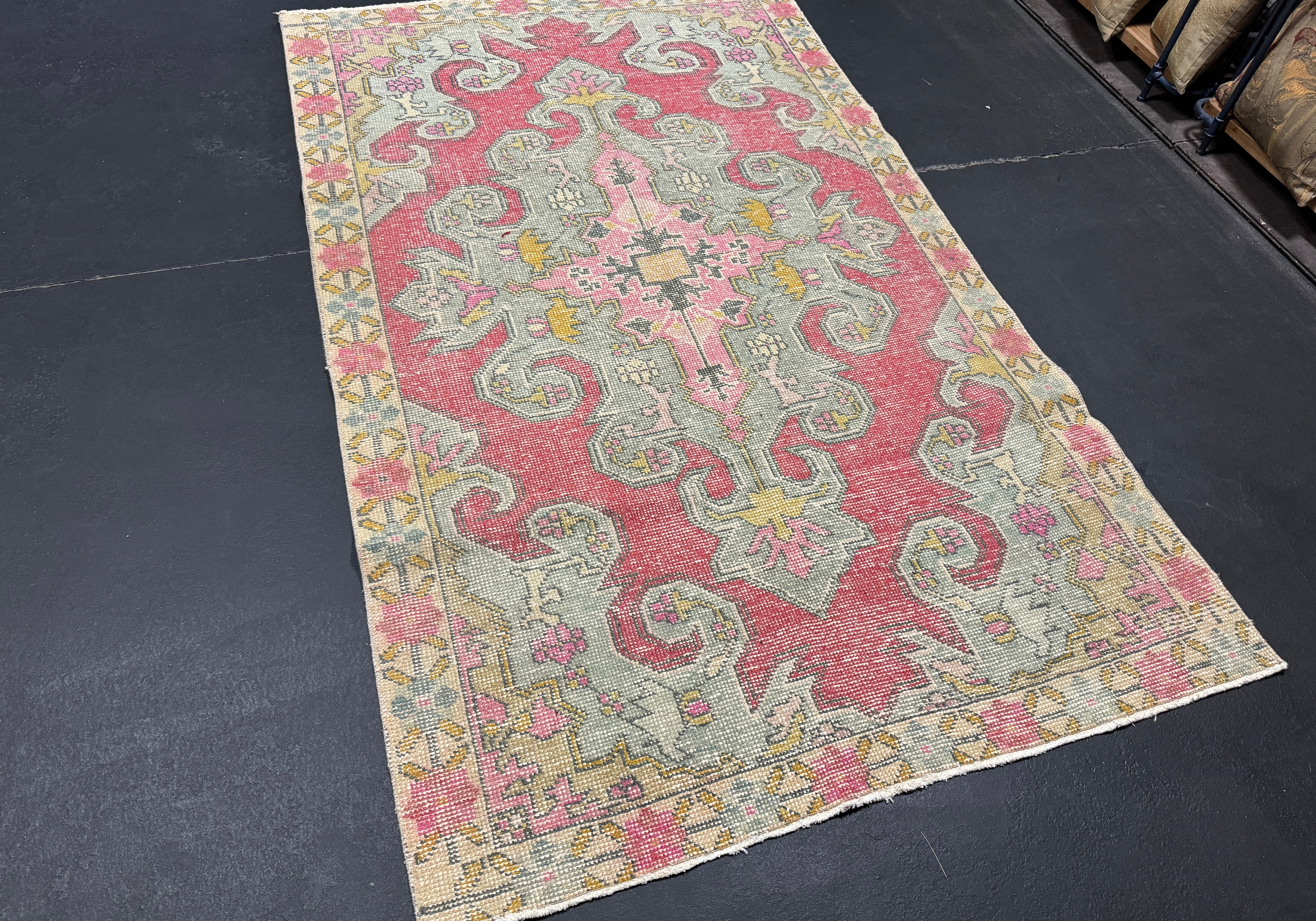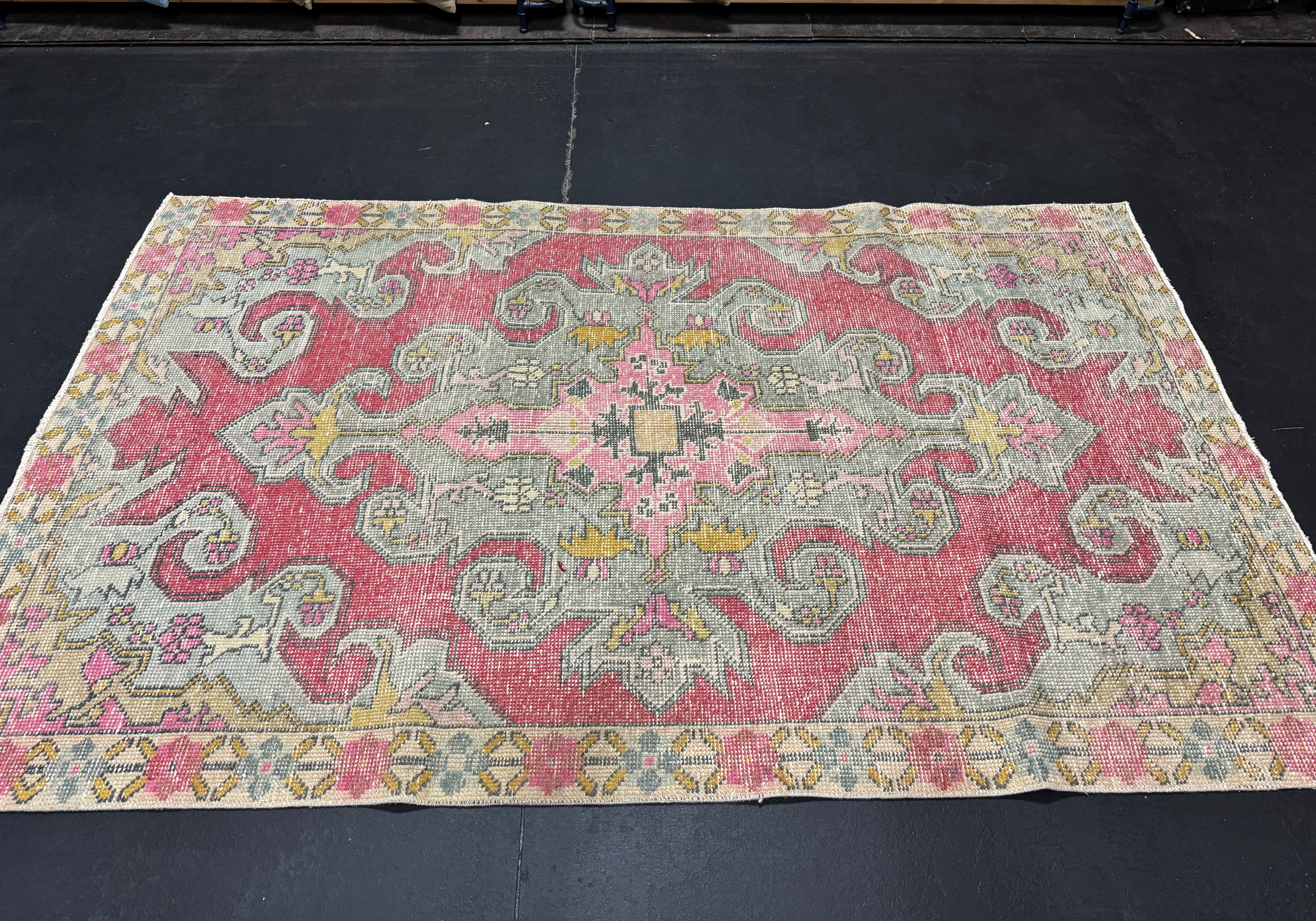 4’5 x 7’2 Vintage Oushak Rug Very Muted Watermelon, Blue and Pink 4379