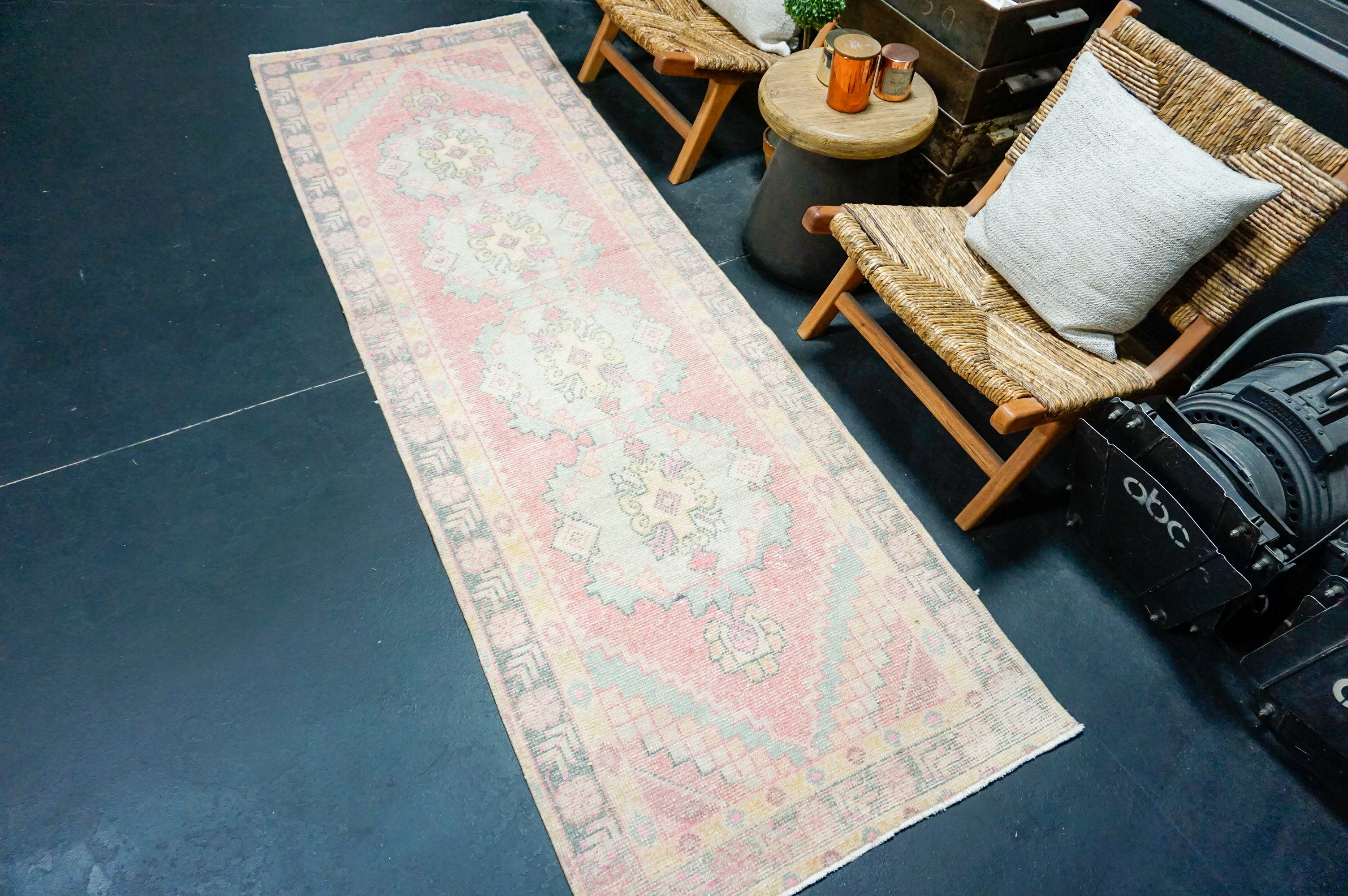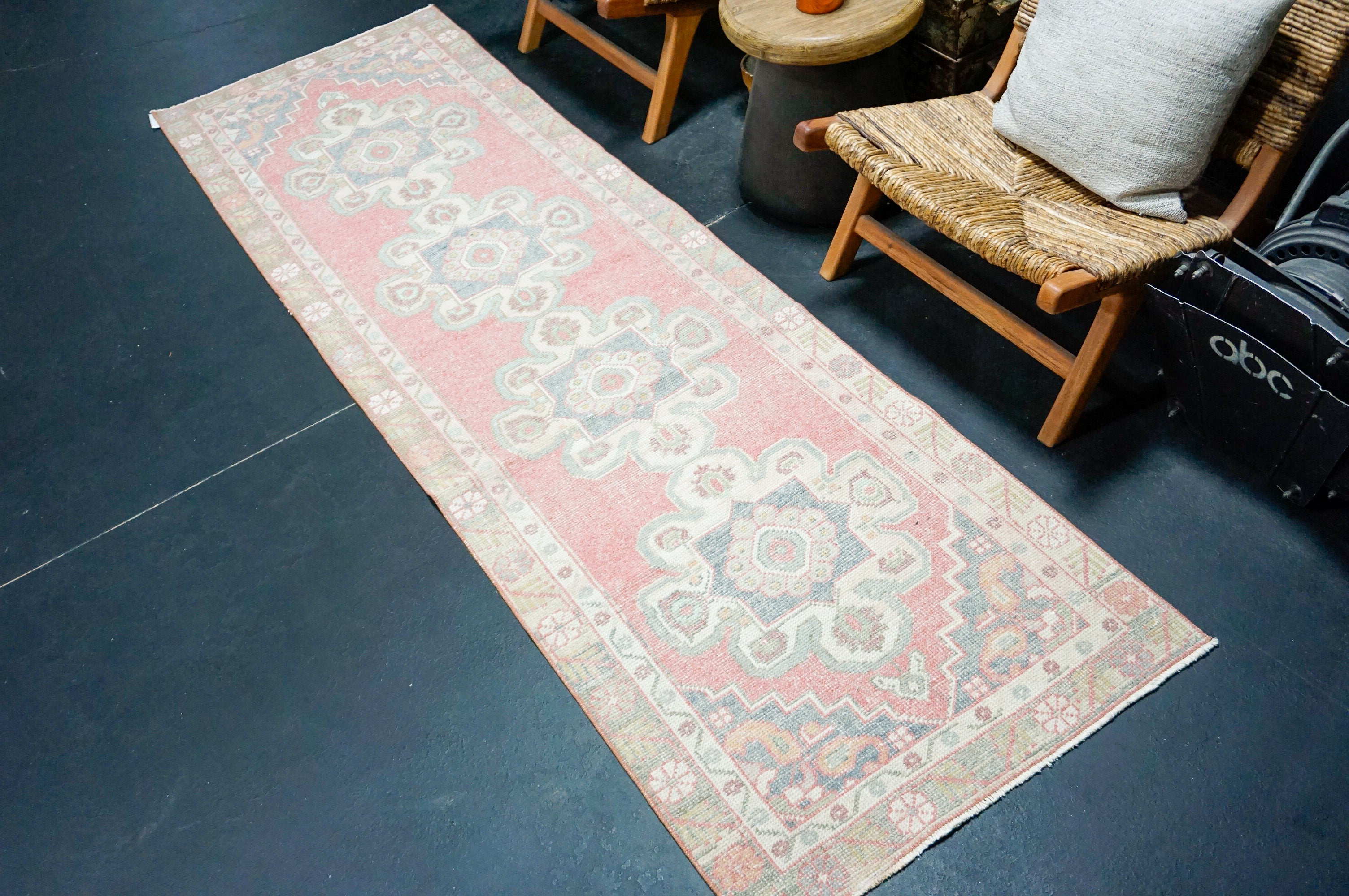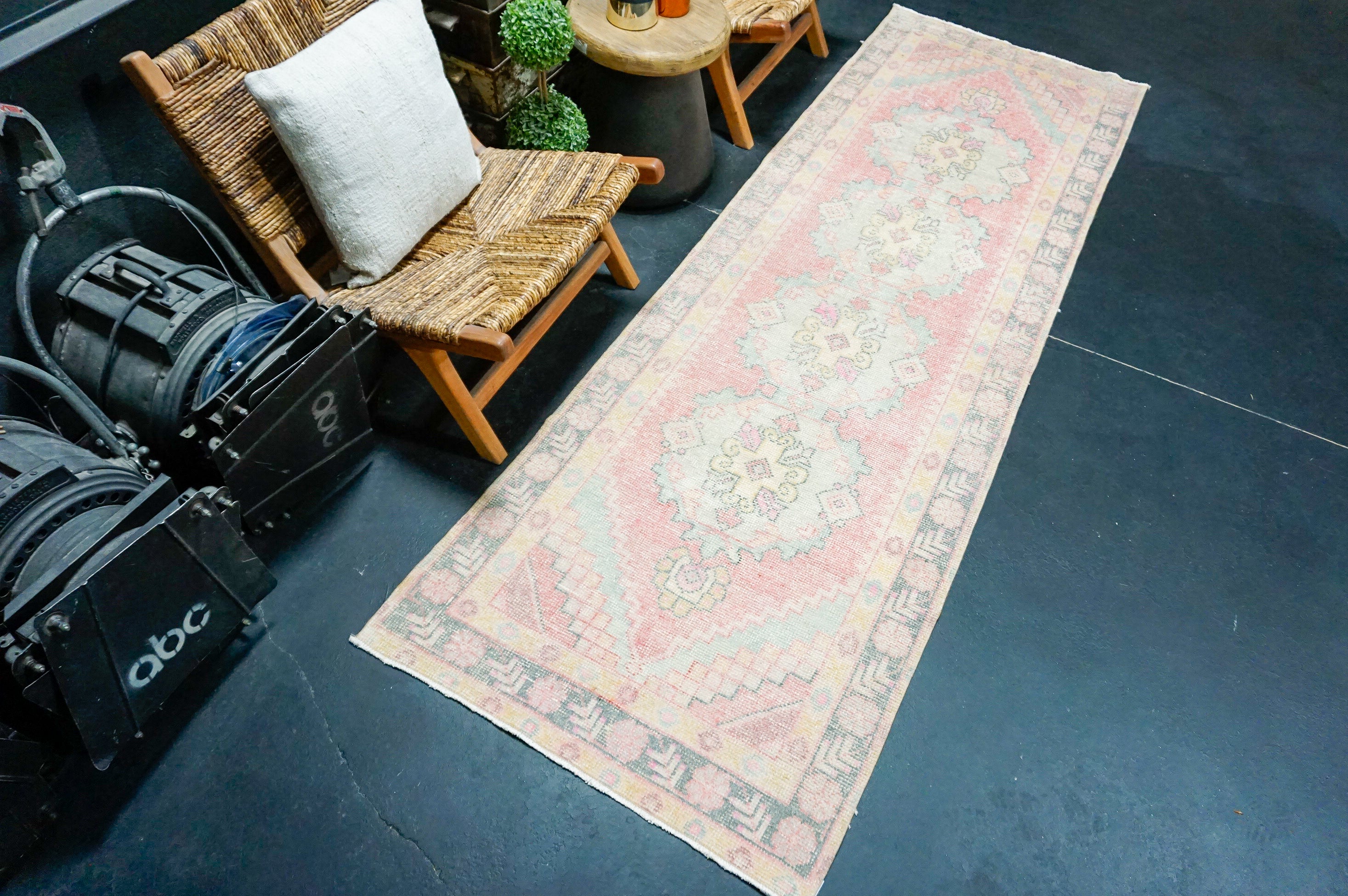 3’2 x 9’8 Vintage Oushak Runner Muted Pastel Colors, Blue, Gray, Pink