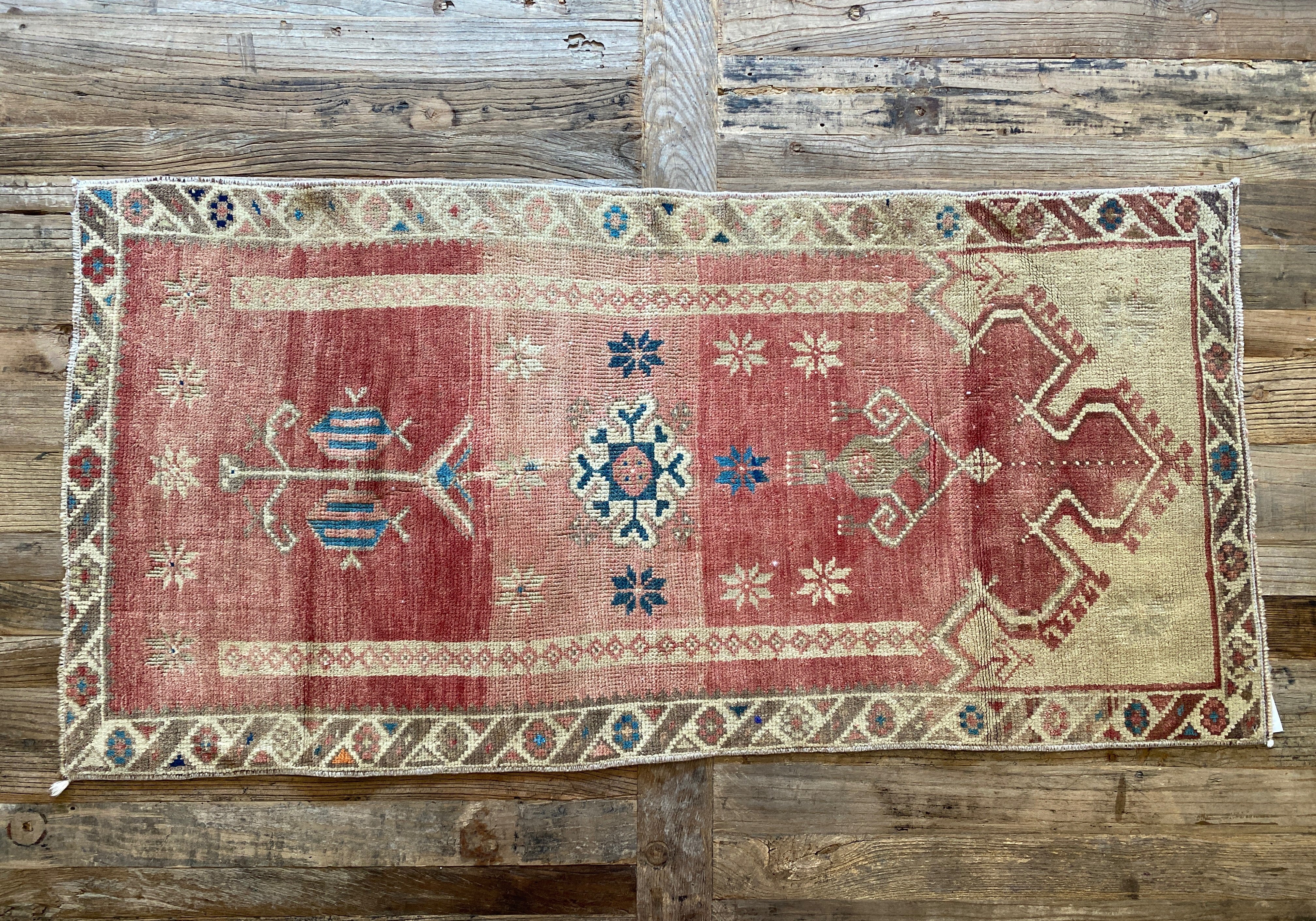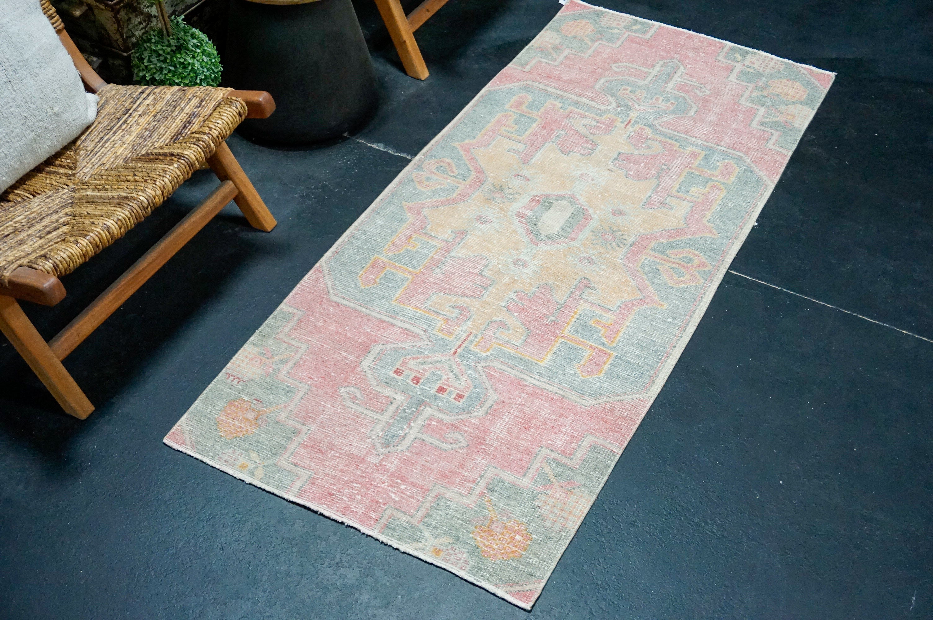 2’3 x 5’8 Vintage Oushak Runner Muted Red, Saffron + Gray '3856