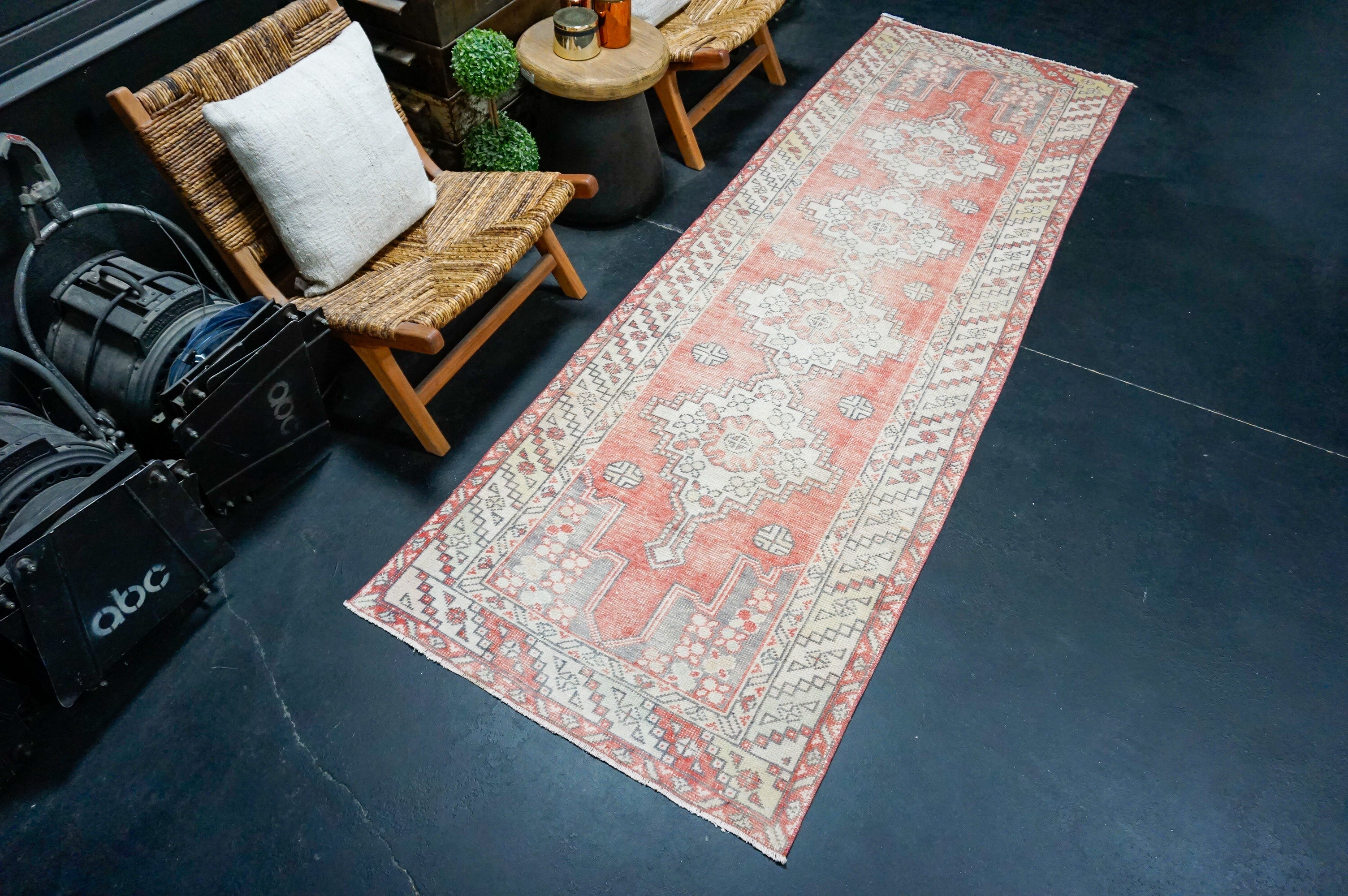 3’2 x 9’10 Vintage Turkish Oushak Runner Muted Red, Bone + Gray '4371