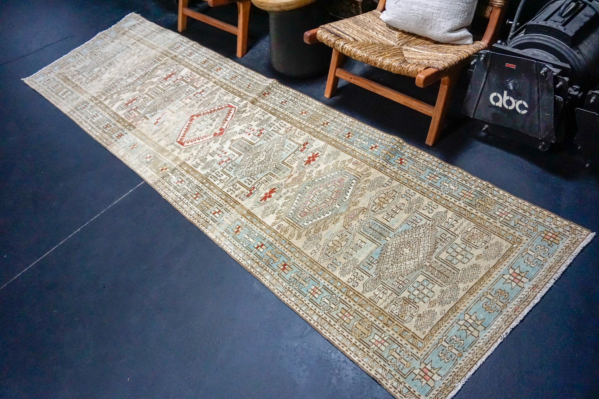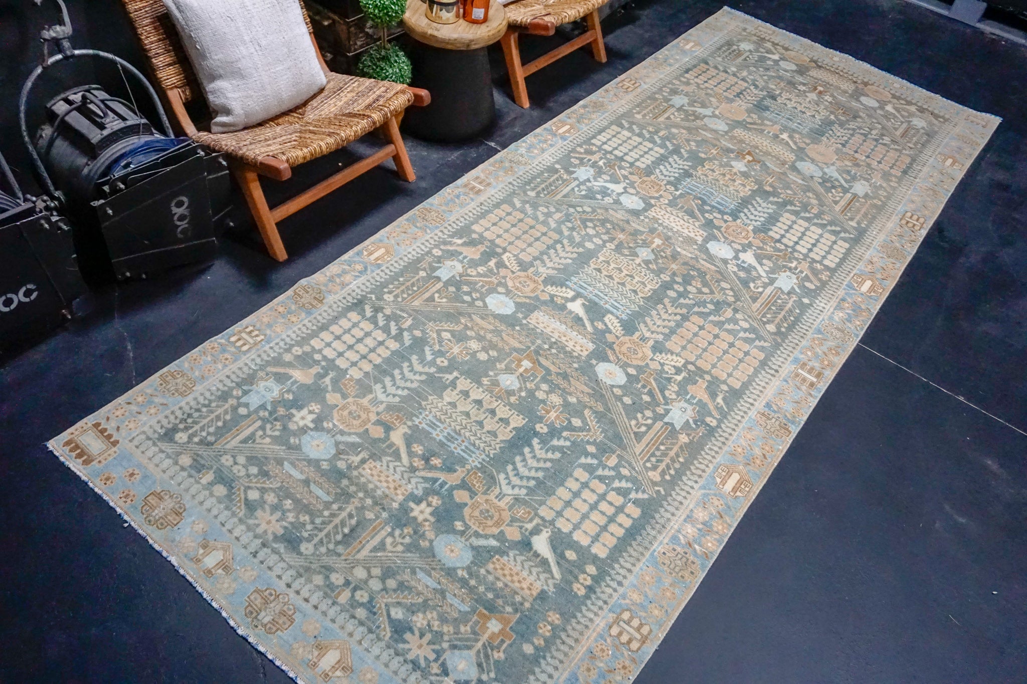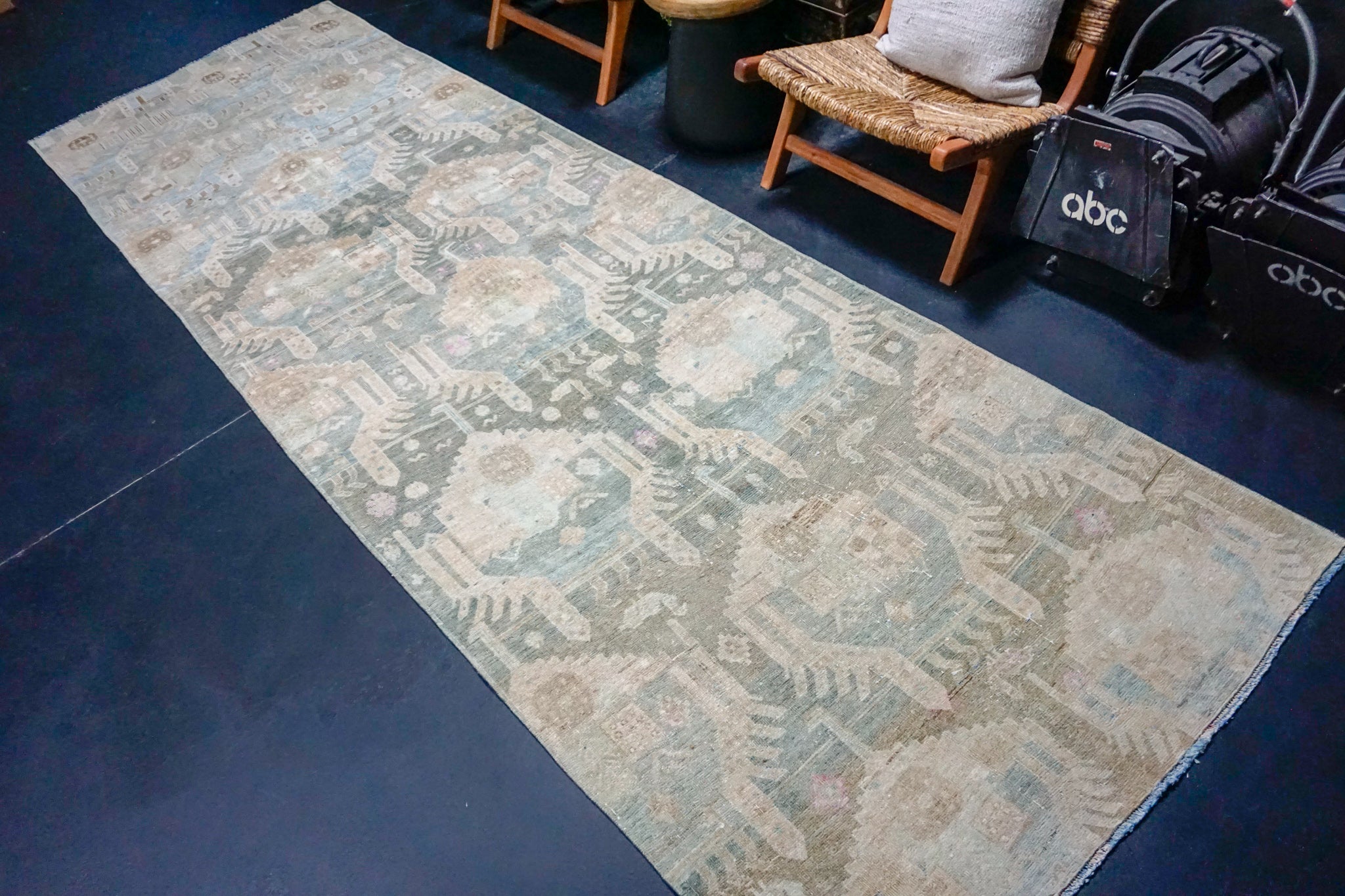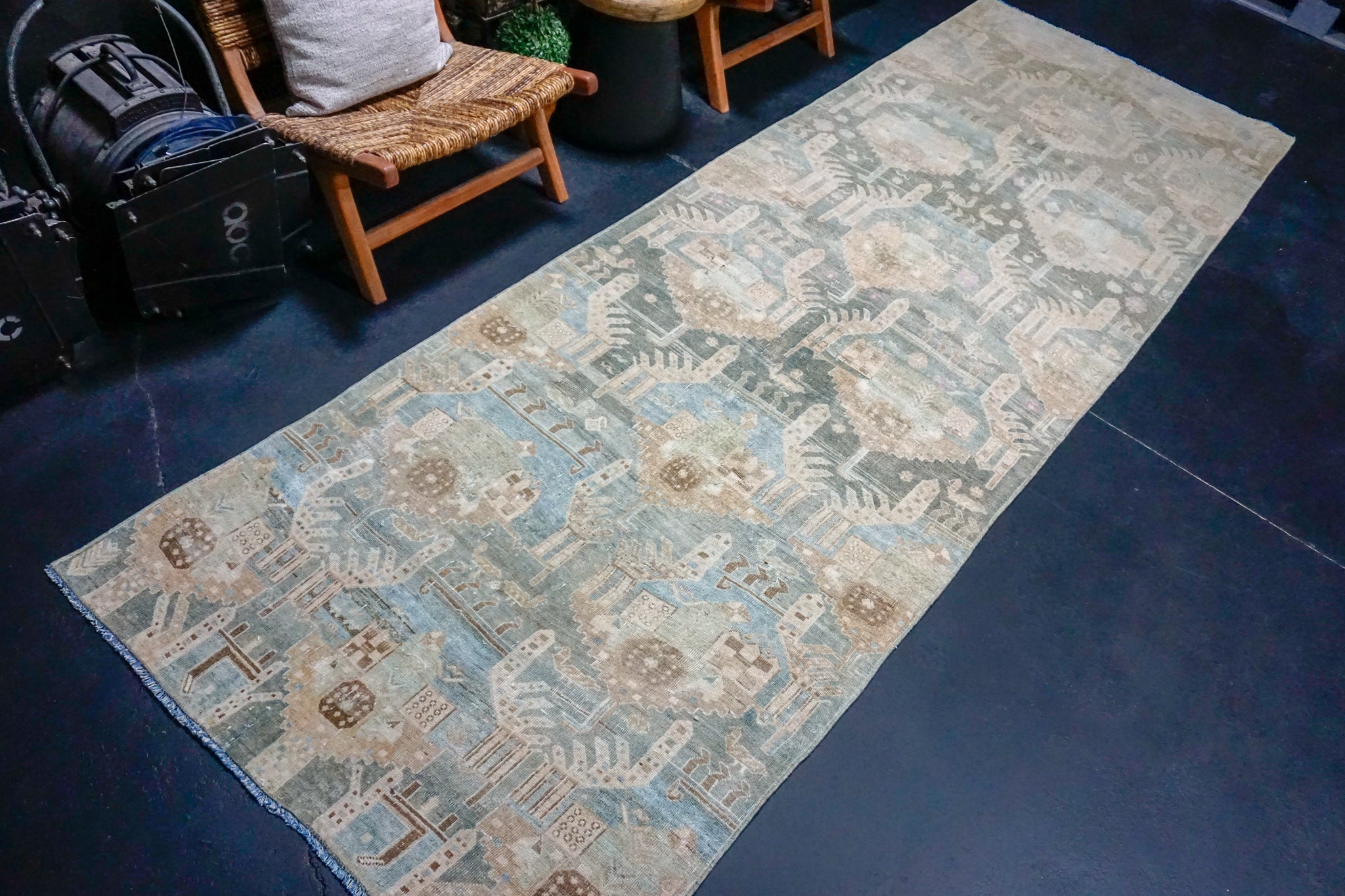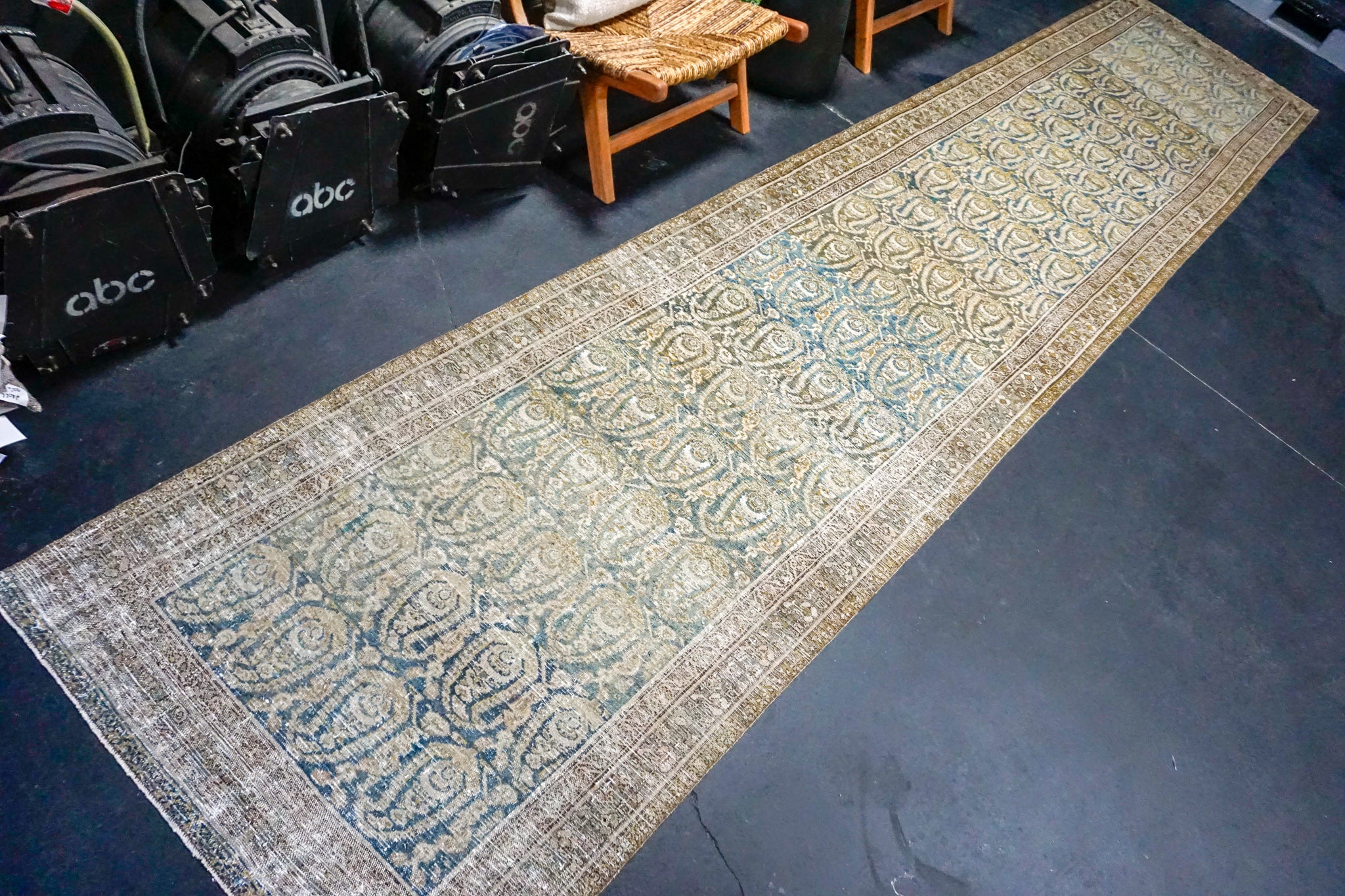 4’2 x 12’8 Antique Runner Muted Sea Foam Green, Camel Beige + Blue '4201