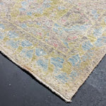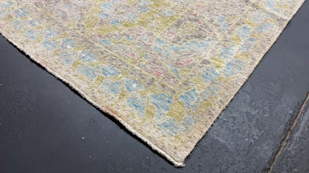 The colors are pretty blues, chartreuse, pink, aubergine or violet and silvery gray. each knot has many variations in color and depth with the rug having over 60 colors giving it extreme depth and dimension...such a work of art.