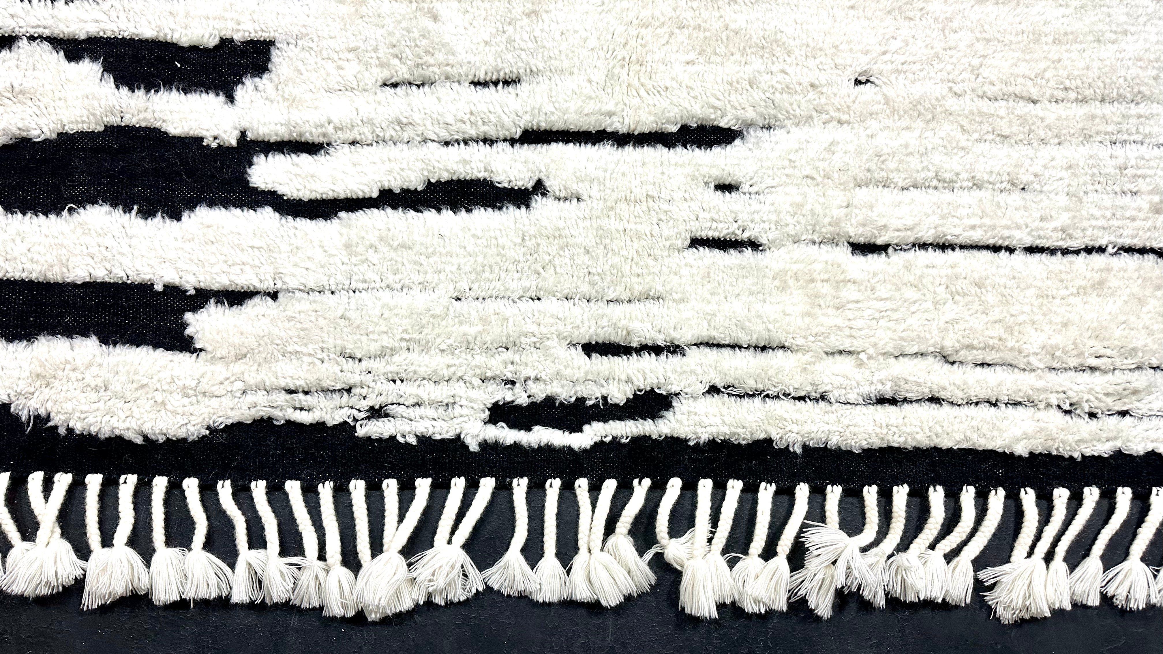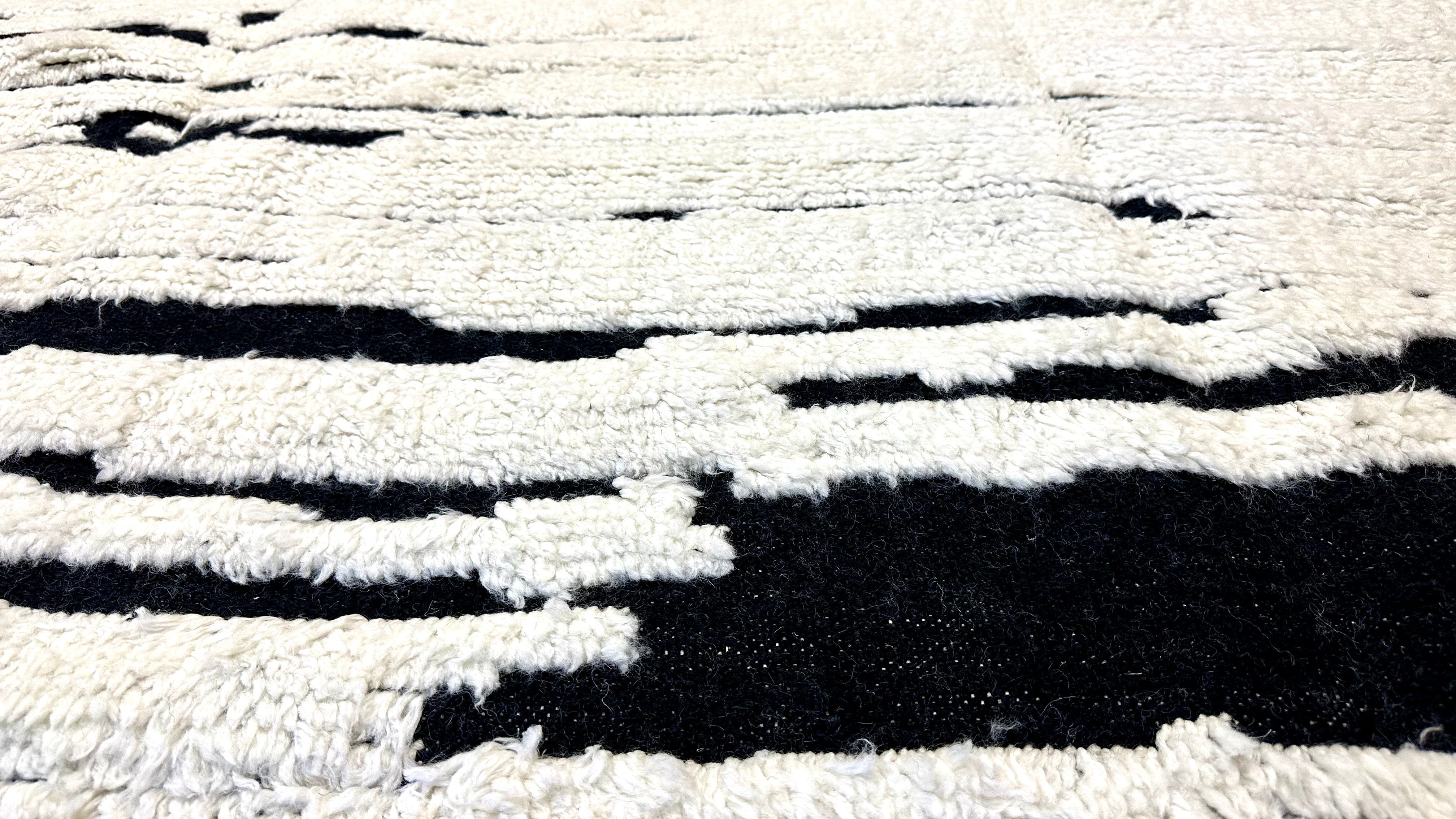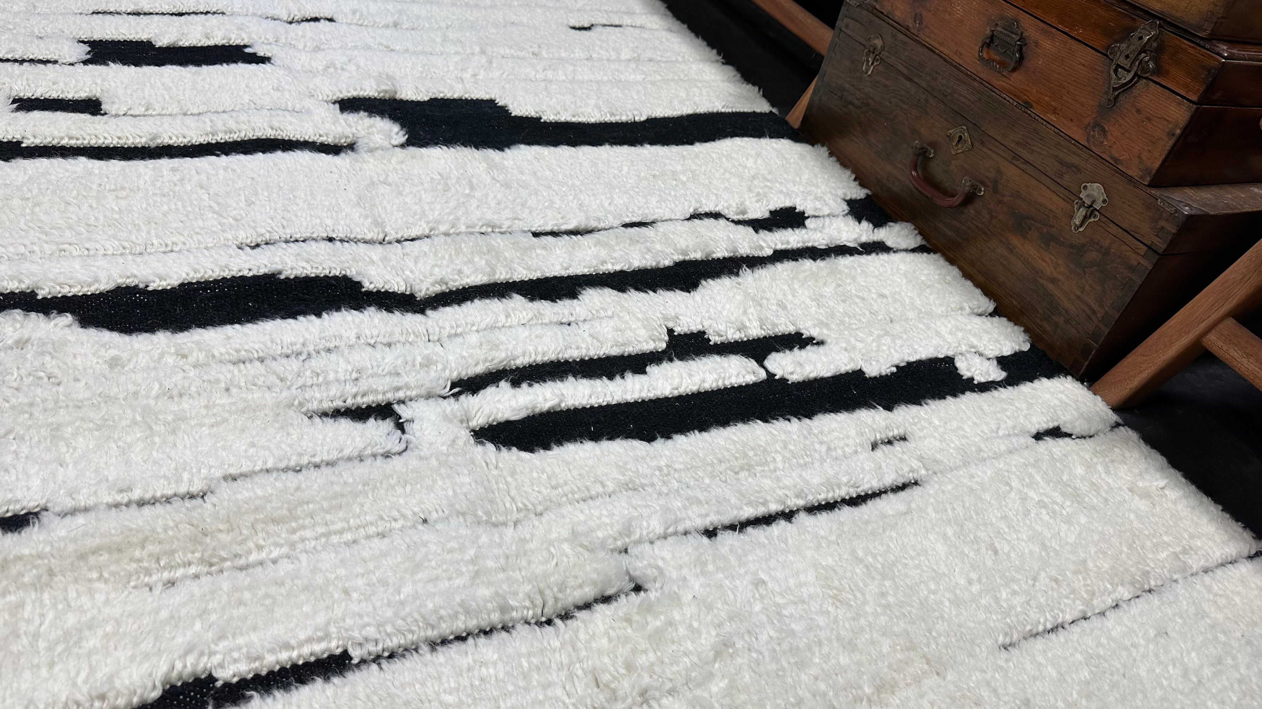 This is a handmade Moroccan style high shag/ low pile rug. it is made with pure Turkish wool in a creamy white color that has not been dyed. Pile height on the shag is approximately 1 1/2” . In between the pile is flatwoven black wool which give it a 3 dimensional texture. it has a luxurious feel.