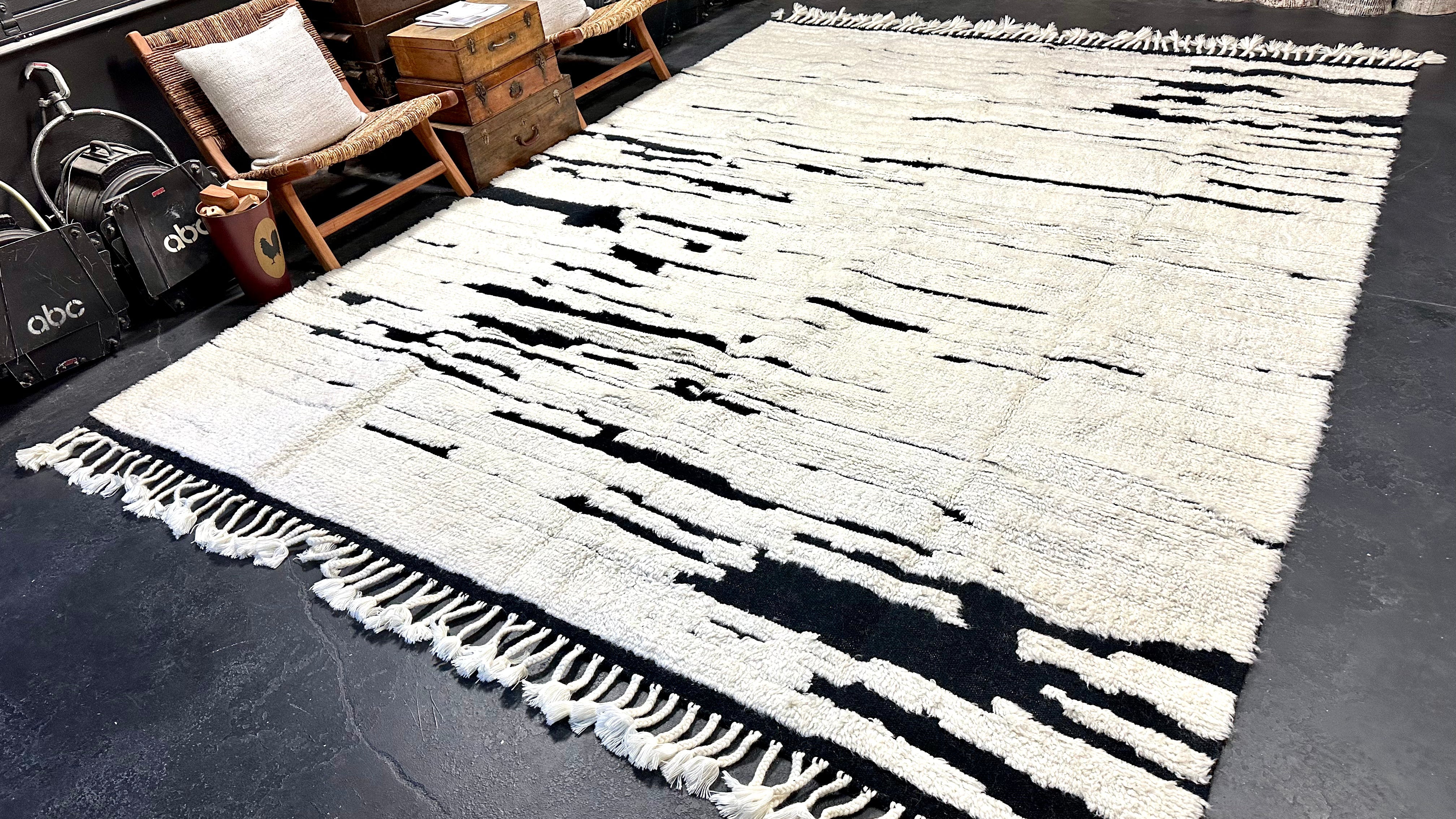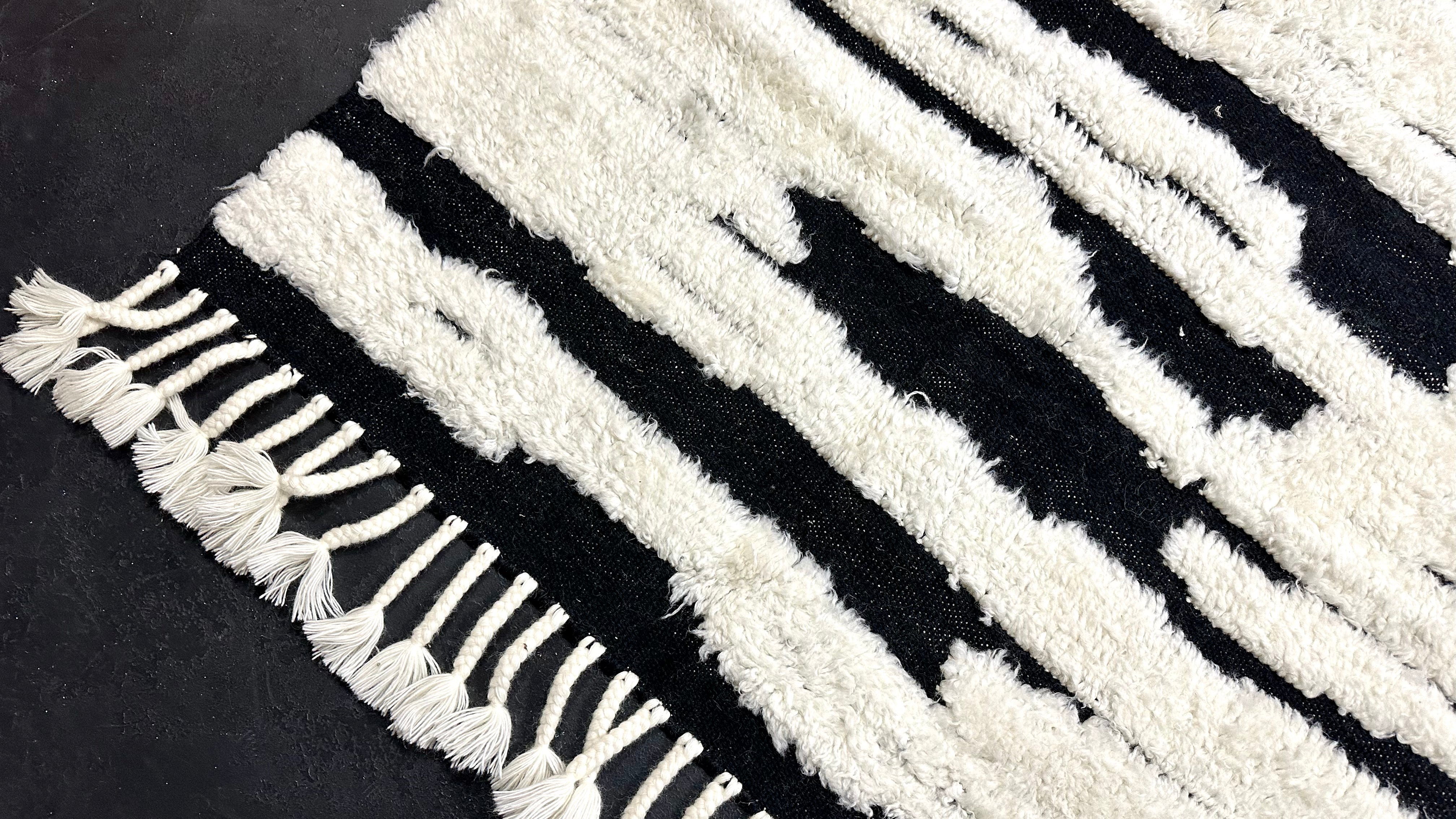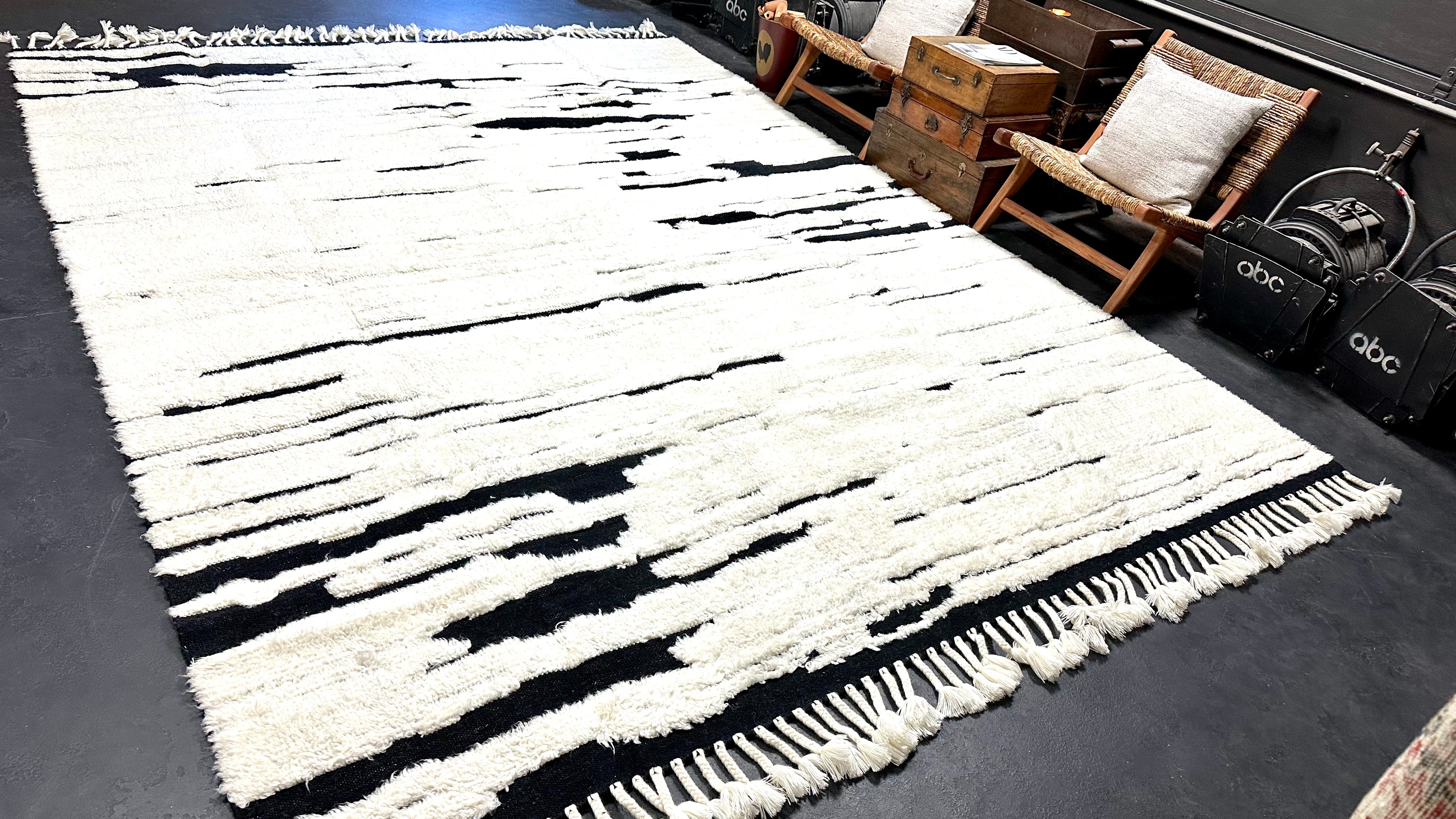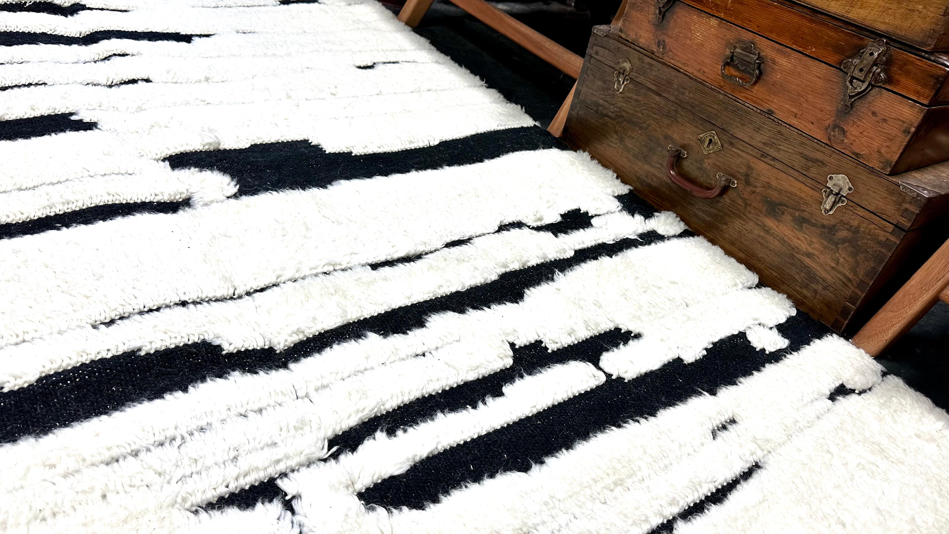 This is a handmade Moroccan style high shag/ low pile rug. it is made with pure Turkish wool in a creamy white color that has not been dyed. Pile height on the shag is approximately 1 1/2” . In between the pile is flatwoven black wool which give it a 3 dimensional texture. it has a luxurious feel.