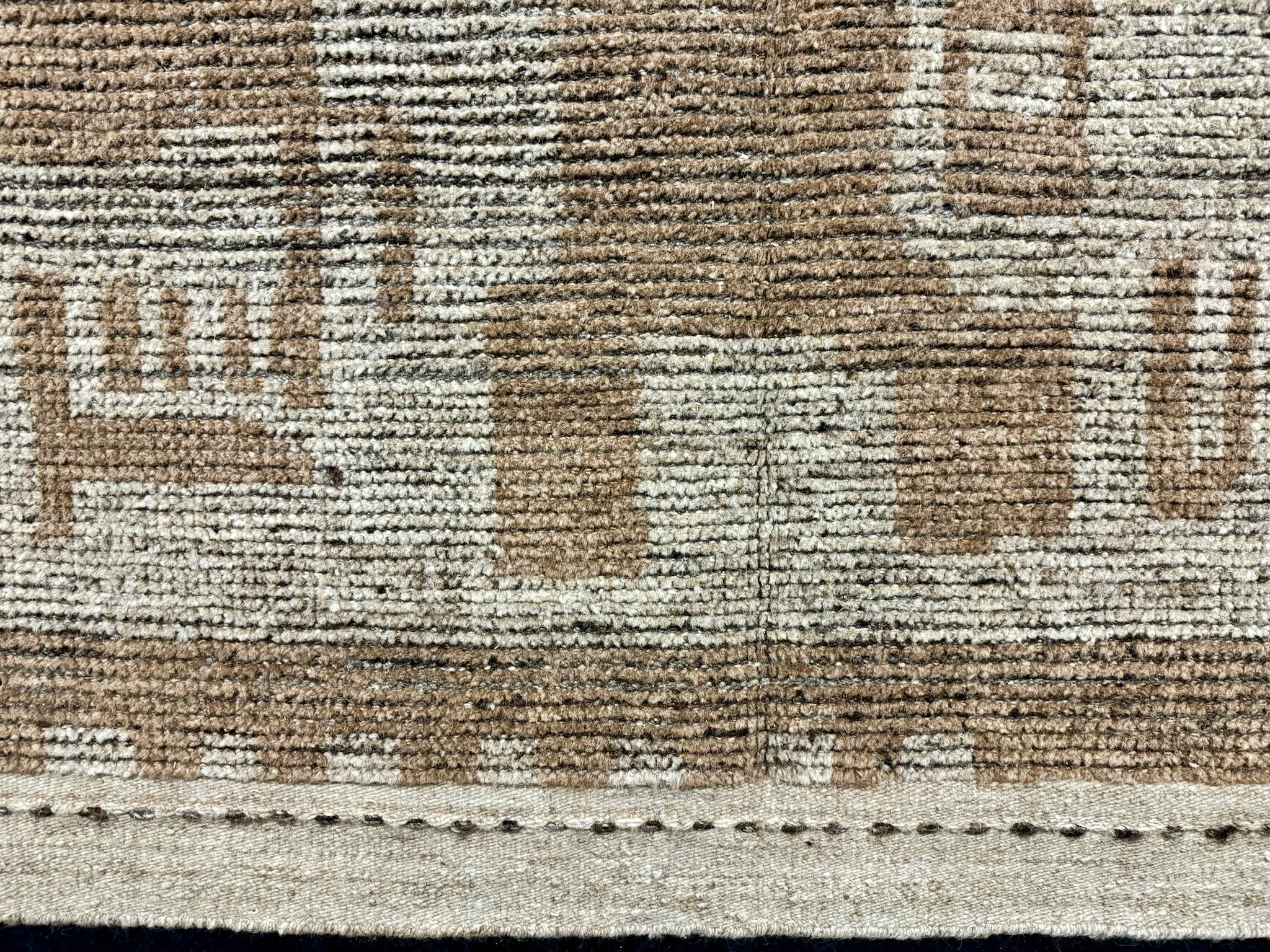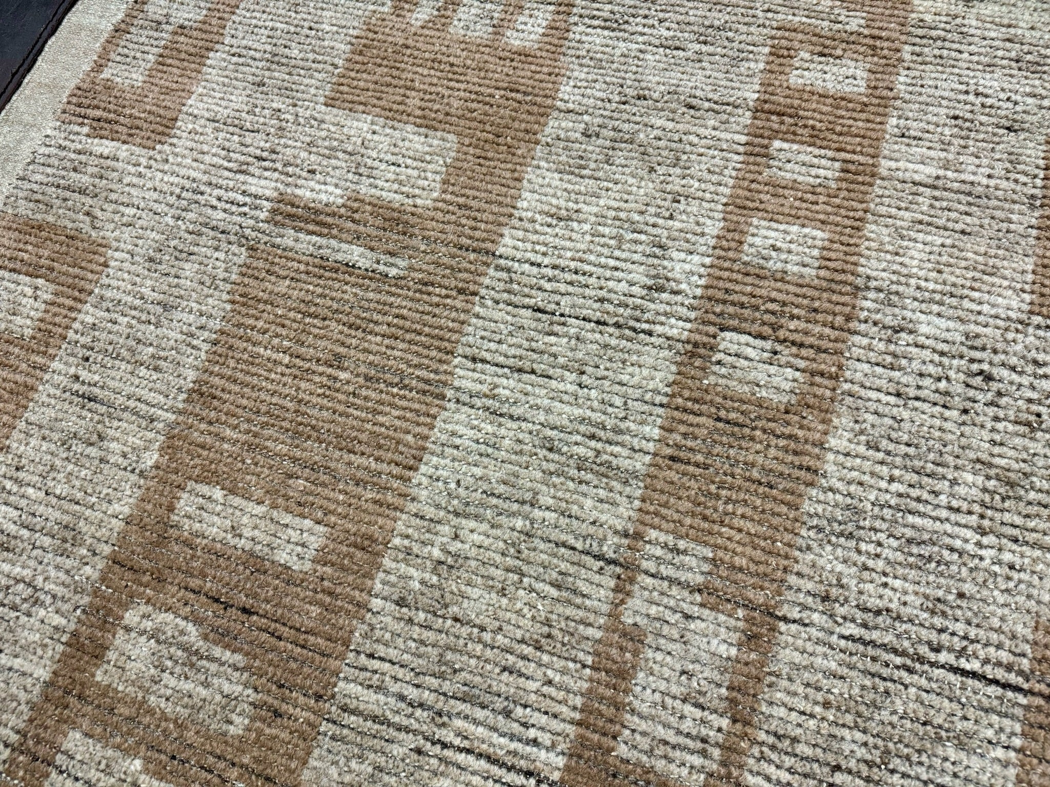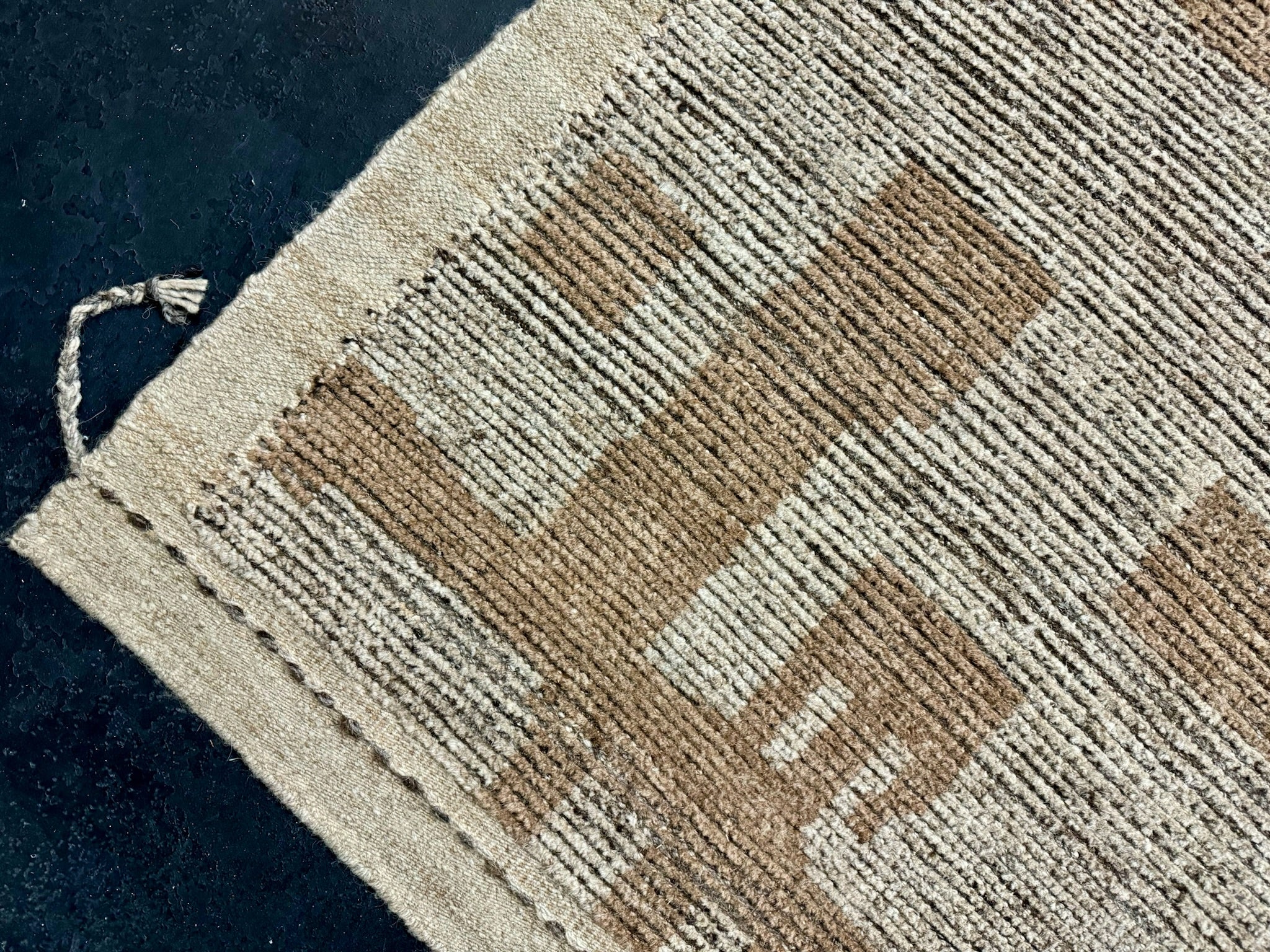 This is a handmade Moroccan style rug. it is made with pure natural undyed organic Afghan wool. It has been hand spun as well as hand knotted Spinning wool by hand gives a vintage feel and vibe. Pile height varies from zero to just above the knots which is approximately 1 and 1/2”... Afghan wool has variations in the wool giving color interest... it has a luxurious feel in between a soft pile and flatwoven rug. The corner tassels are approximately 6” long