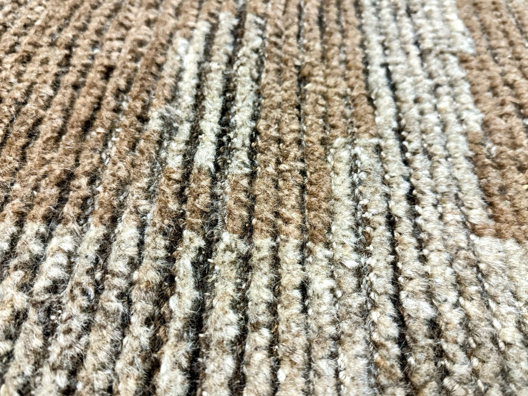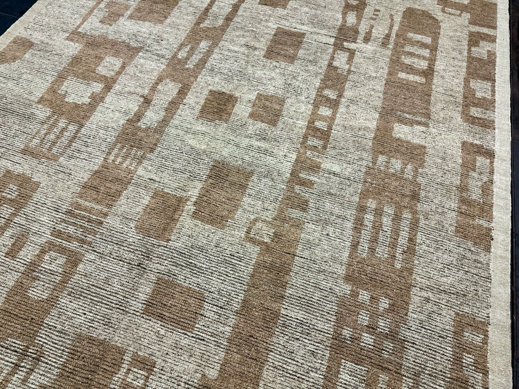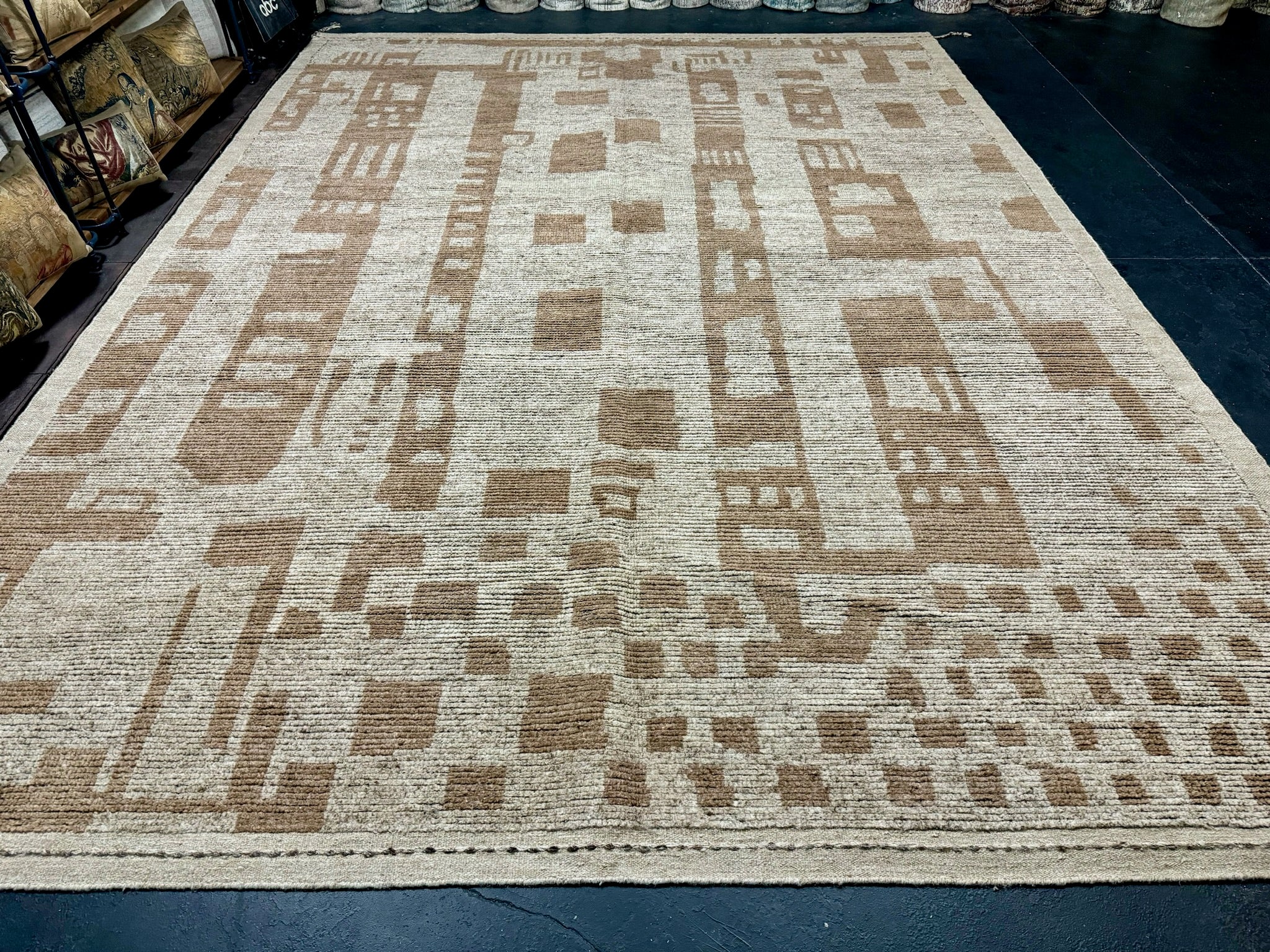 This is a handmade Moroccan style rug. it is made with pure natural undyed organic Afghan wool. It has been hand spun as well as hand knotted Spinning wool by hand gives a vintage feel and vibe. Pile height varies from zero to just above the knots which is approximately 1 and 1/2”... Afghan wool has variations in the wool giving color interest... it has a luxurious feel in between a soft pile and flatwoven rug. The corner tassels are approximately 6” long
