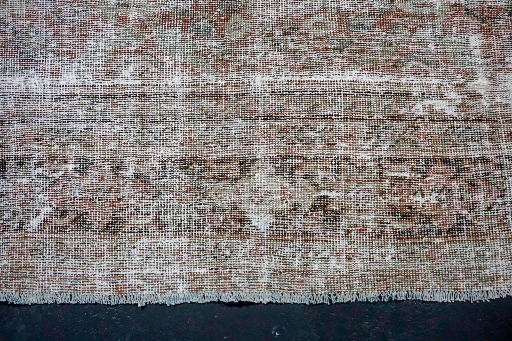The color palette in this pretty rug is muted black, rust, gray, slate blue-gray, olive green and lots of white.