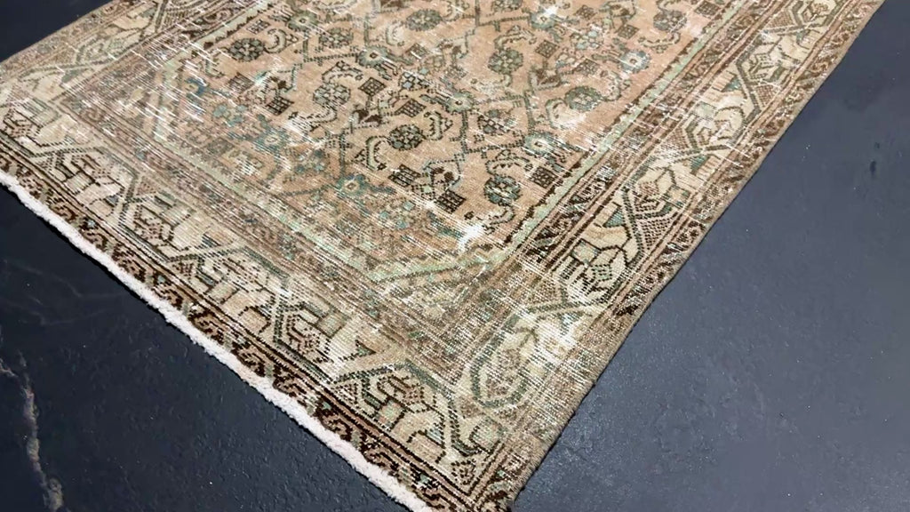 This pretty vintage runner has a main color palette in blush beige, leaf and mint green, bone and brown