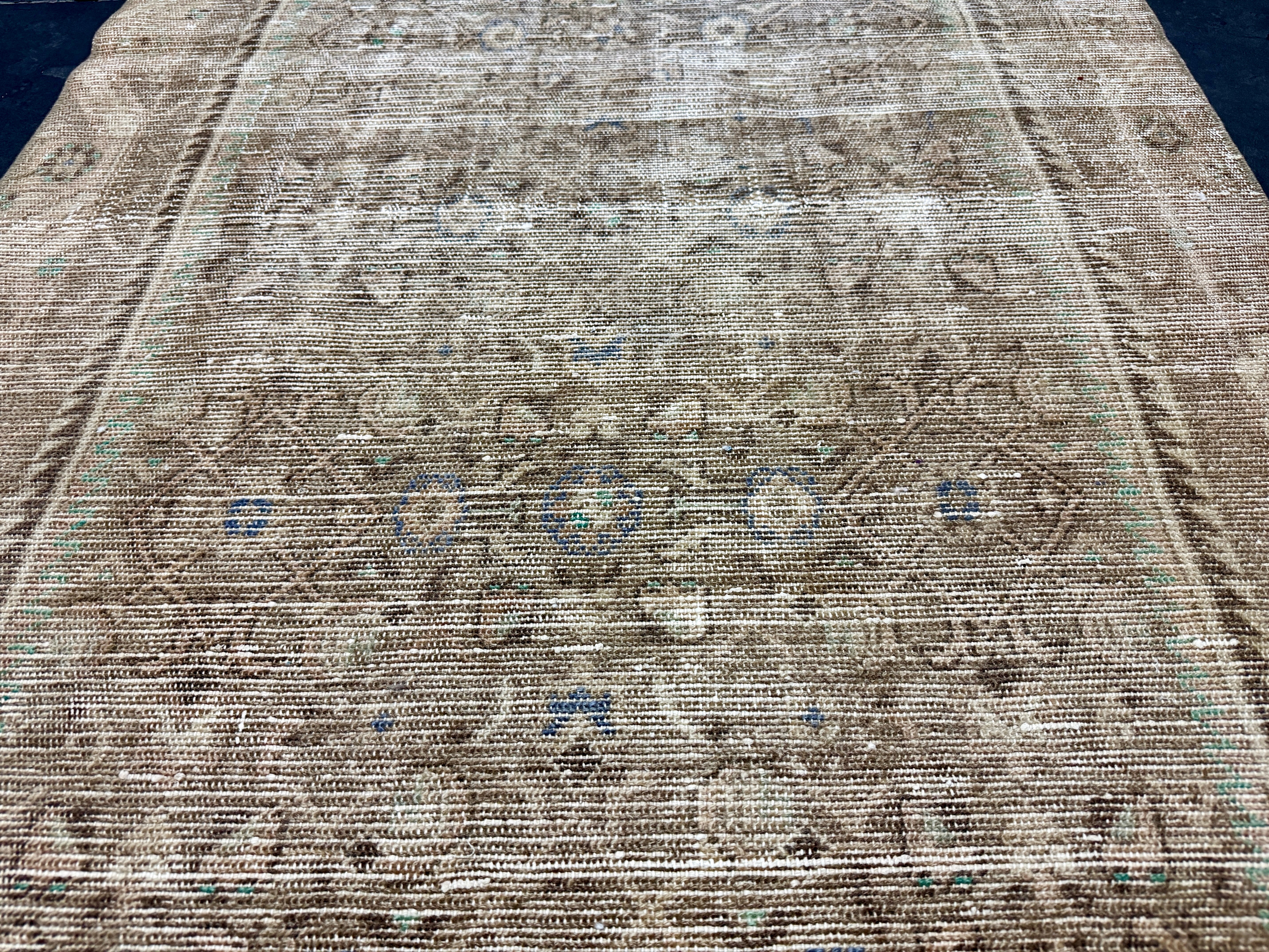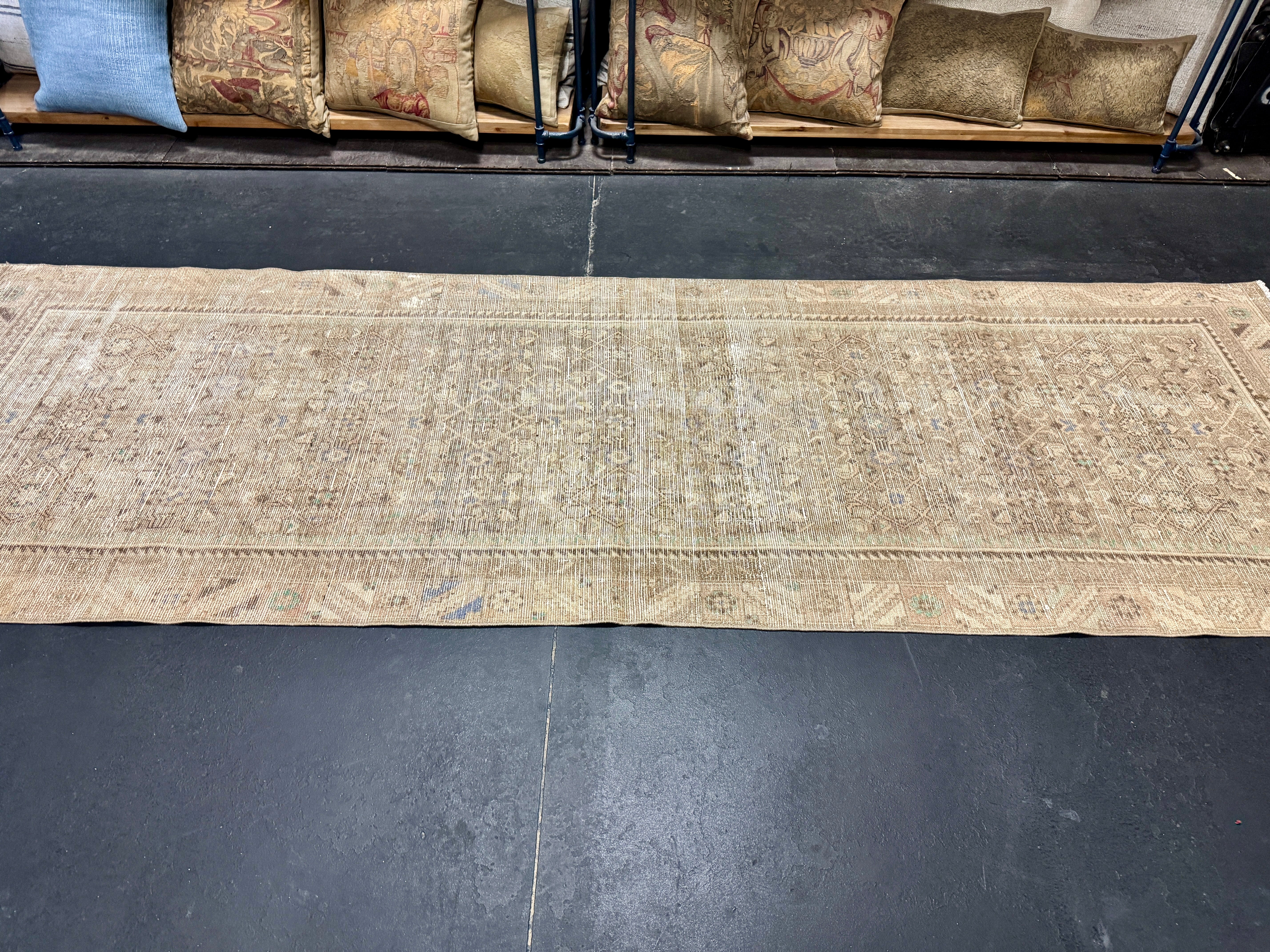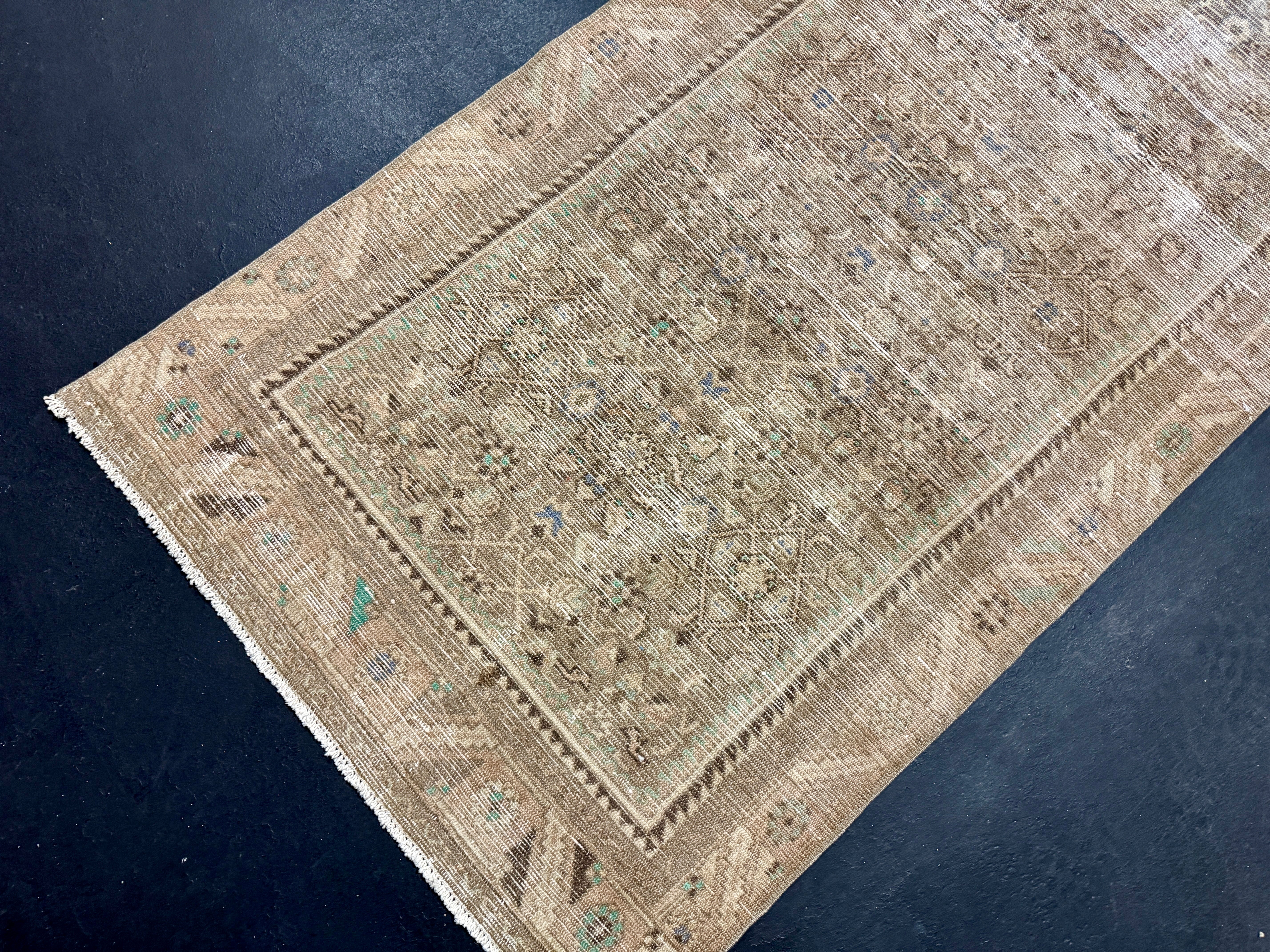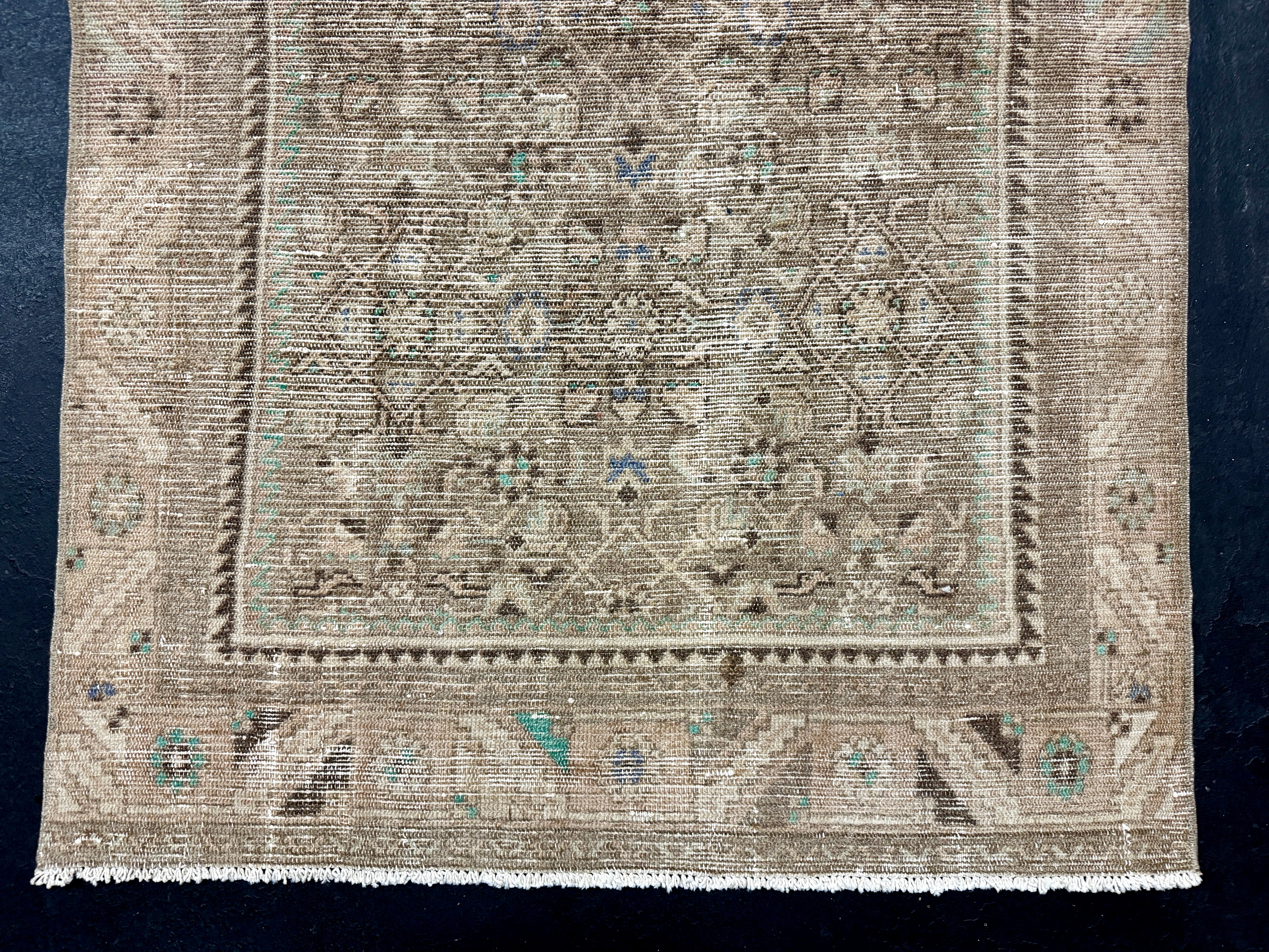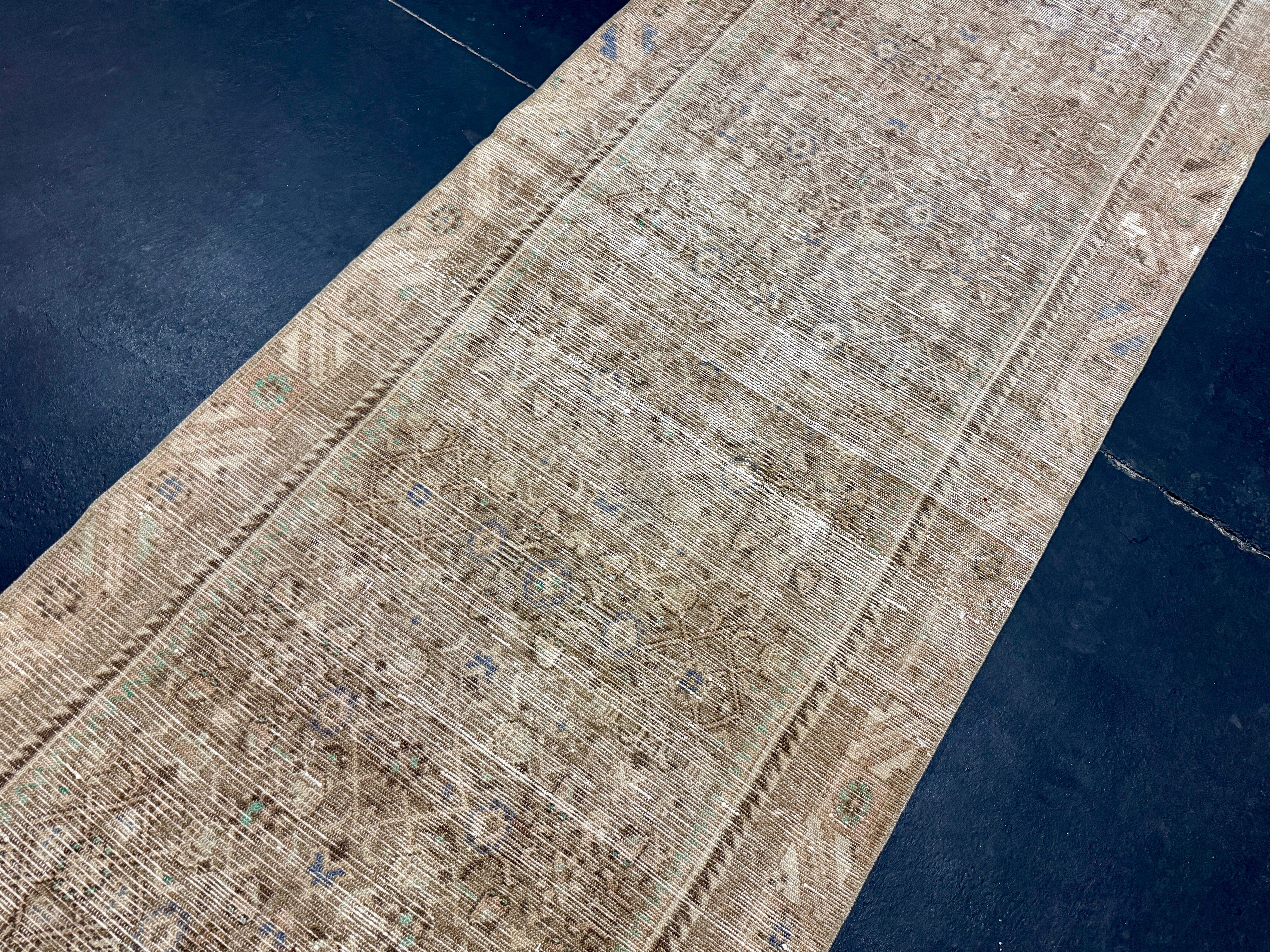 This vintage runner has a very muted color palette in tawny cappuccino beige, blush beige, periwinkle blue, brown and leaf green.