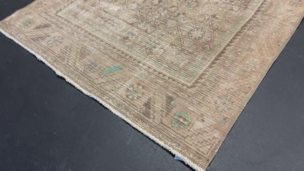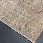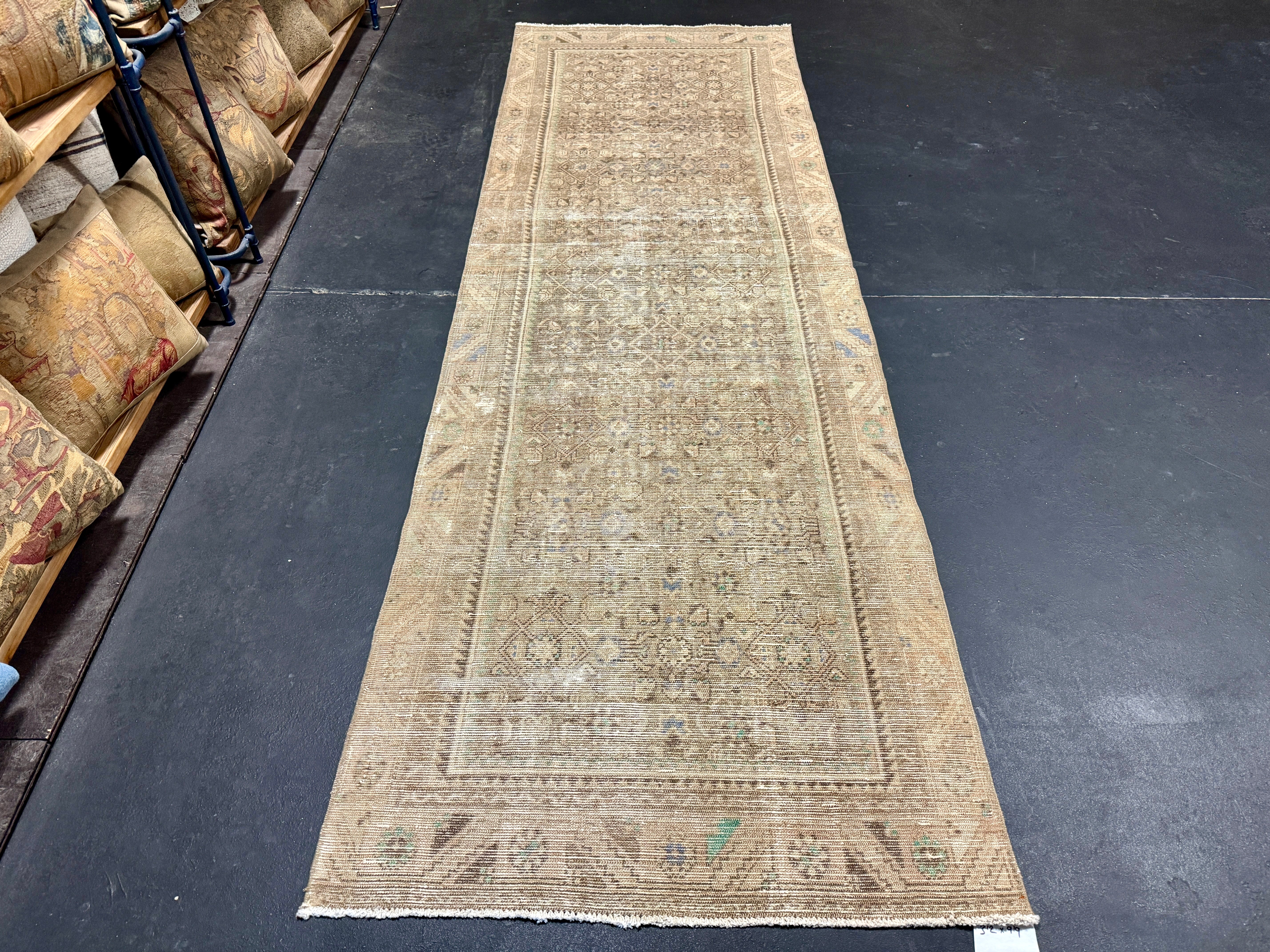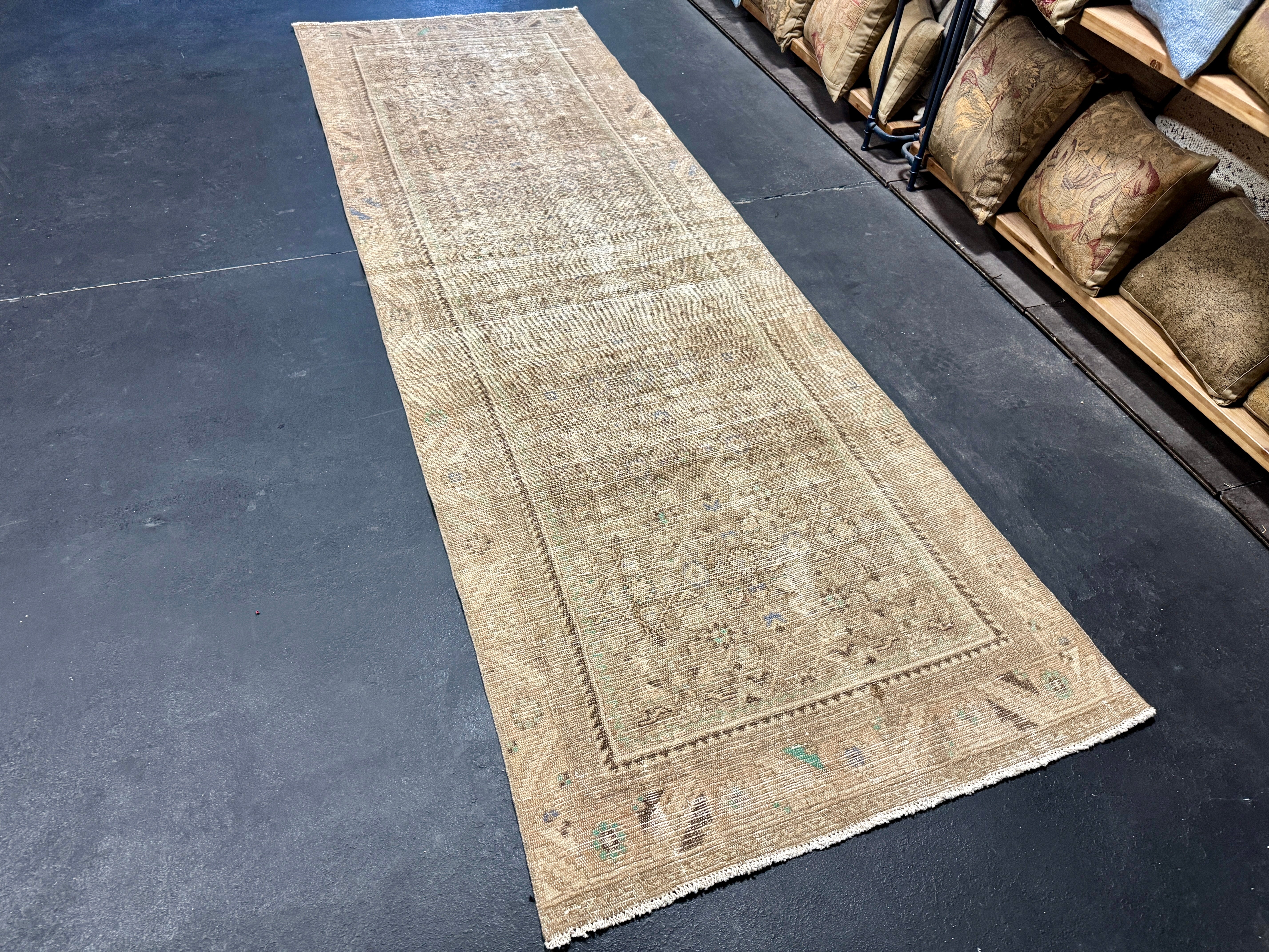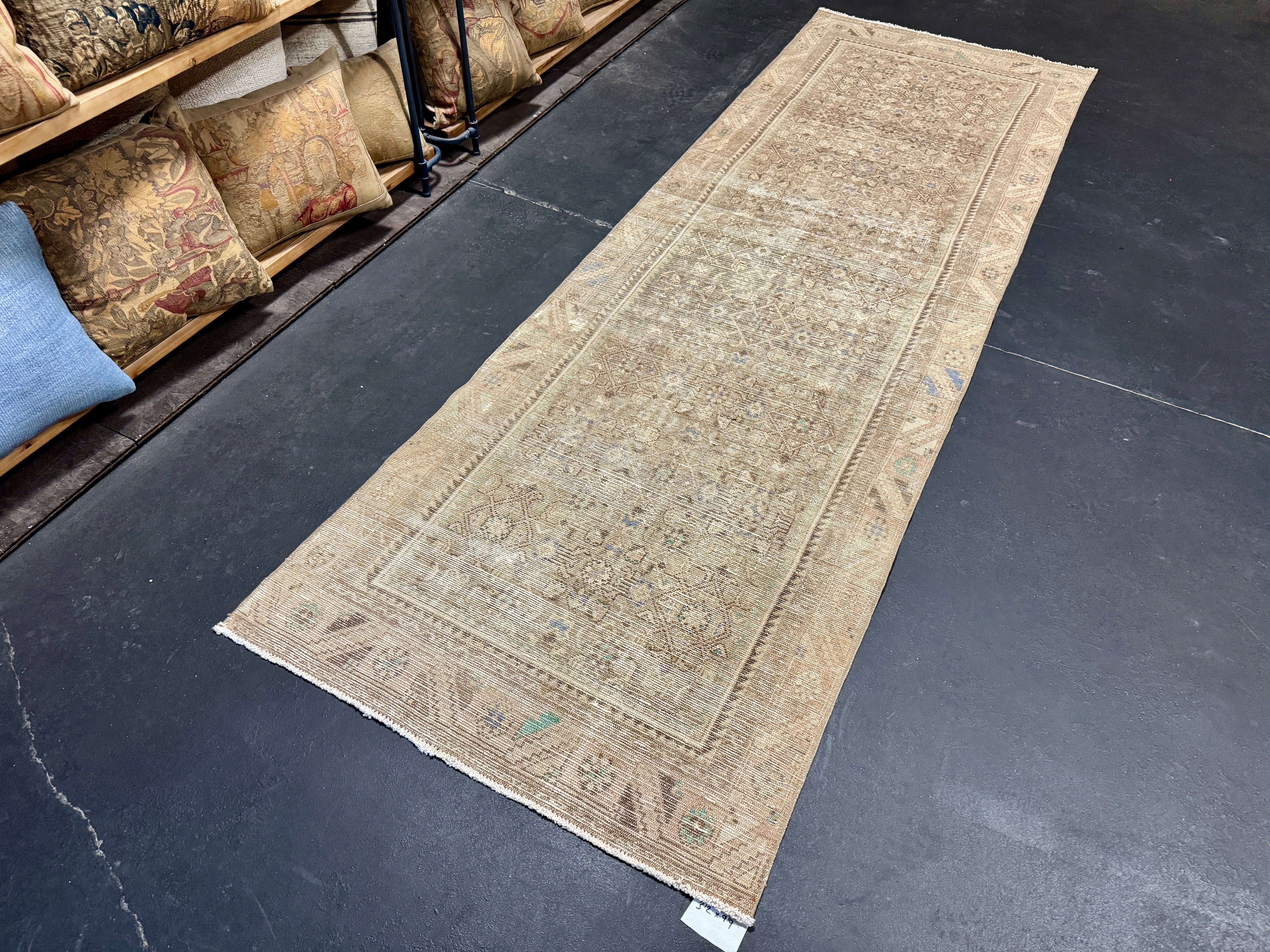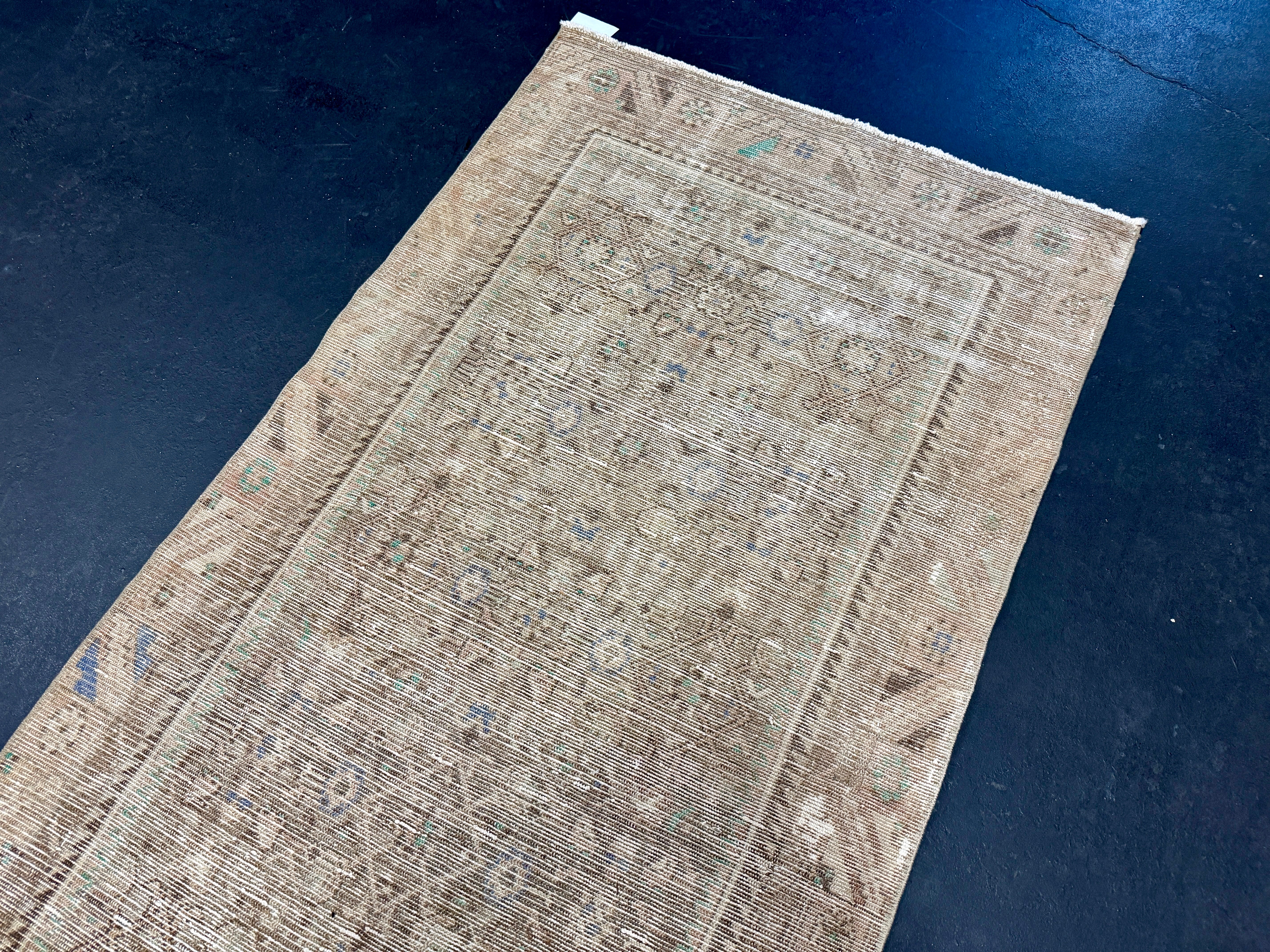 This vintage runner has a very muted color palette in tawny cappuccino beige, blush beige, periwinkle blue, brown and leaf green.