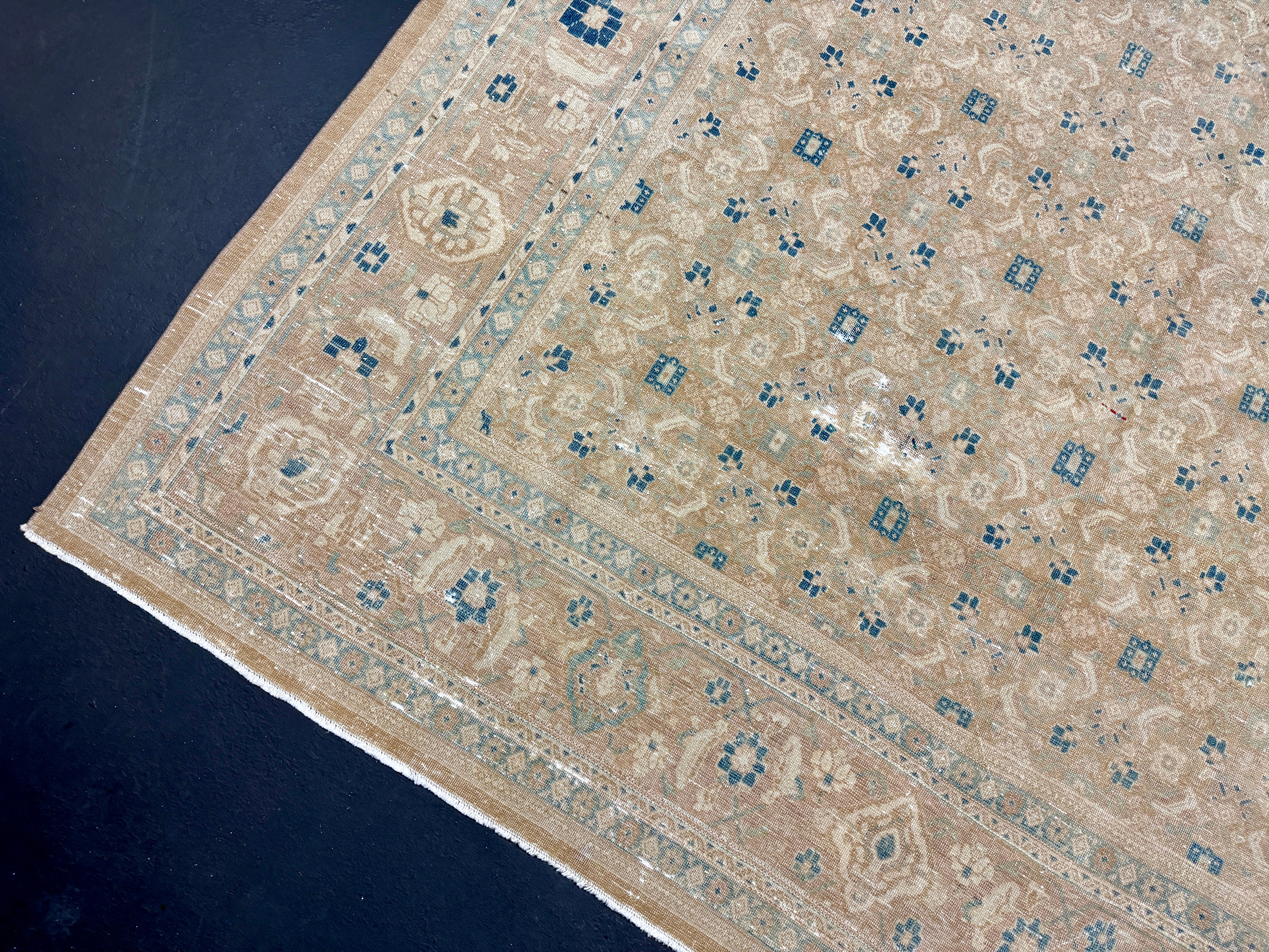 This classic vintage Tabriz area rug is handmade and hand knotted using pure wool