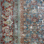 The color palette in this stunning rug is muted turquoise blue, true red, seafoam green and beige