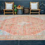 The color palette in this gorgeous all over design rug is salmon red, creamy ecru, pretty light denim blue, and cream with light and medium brown outlines and designs throughout.