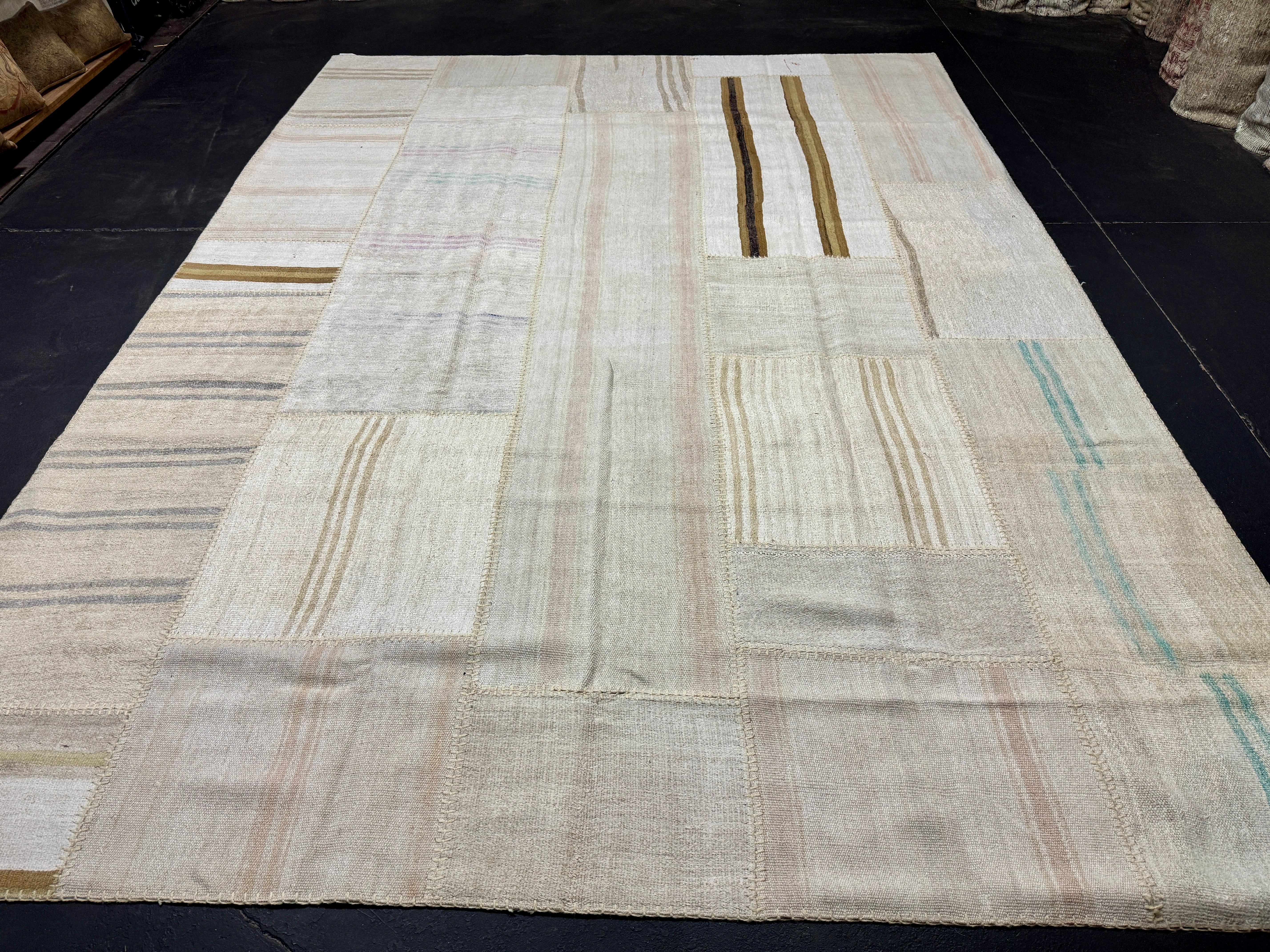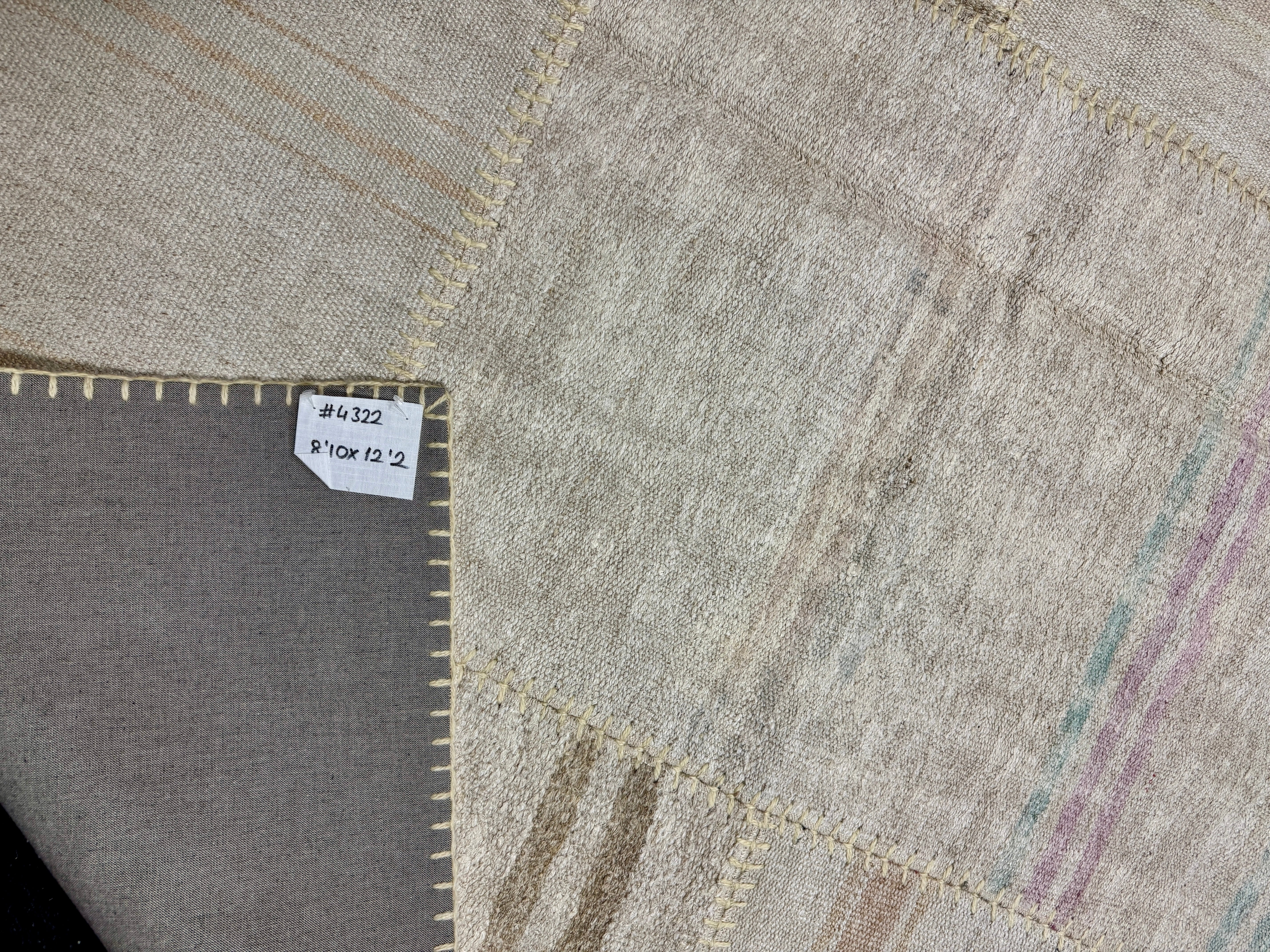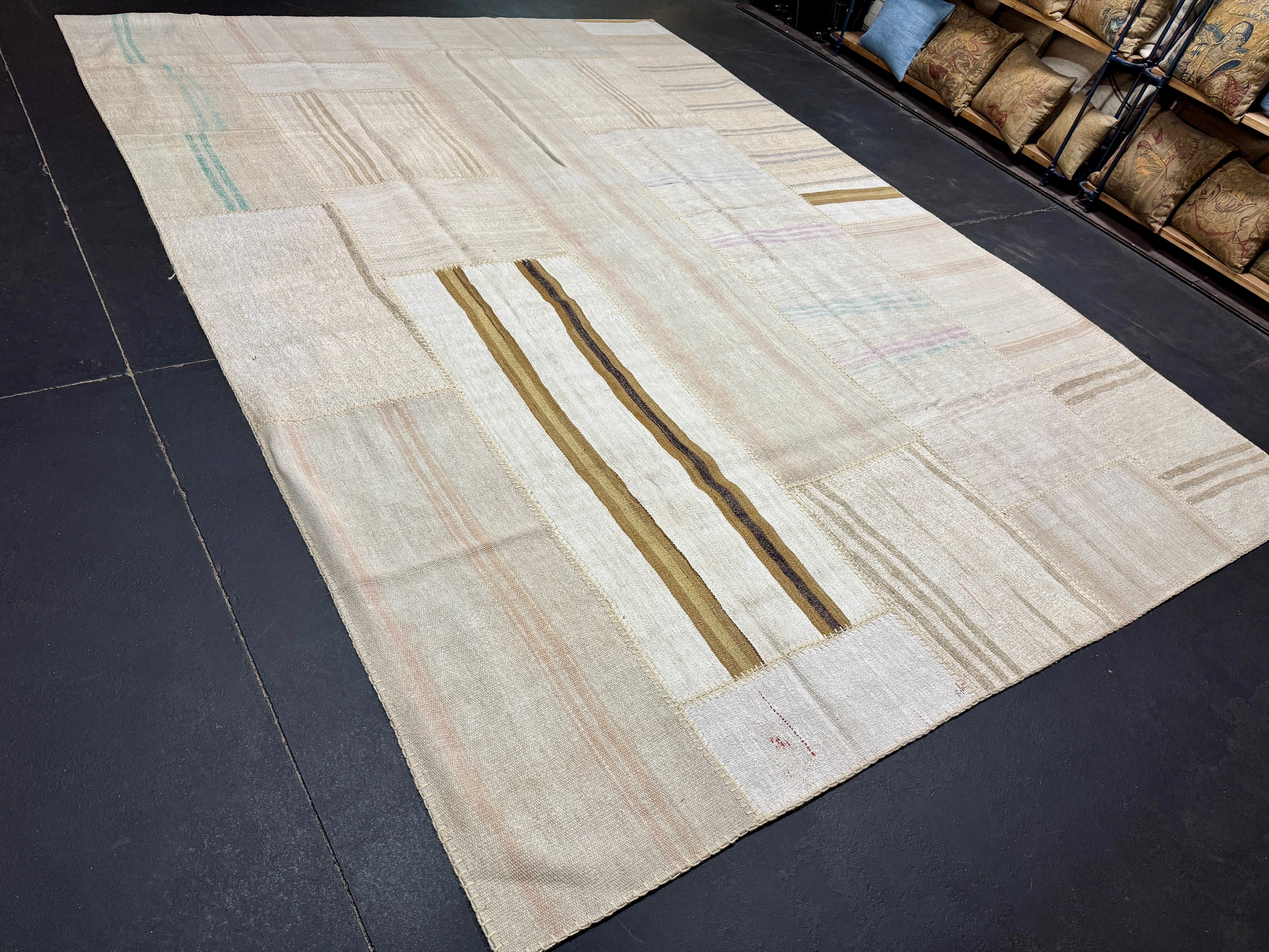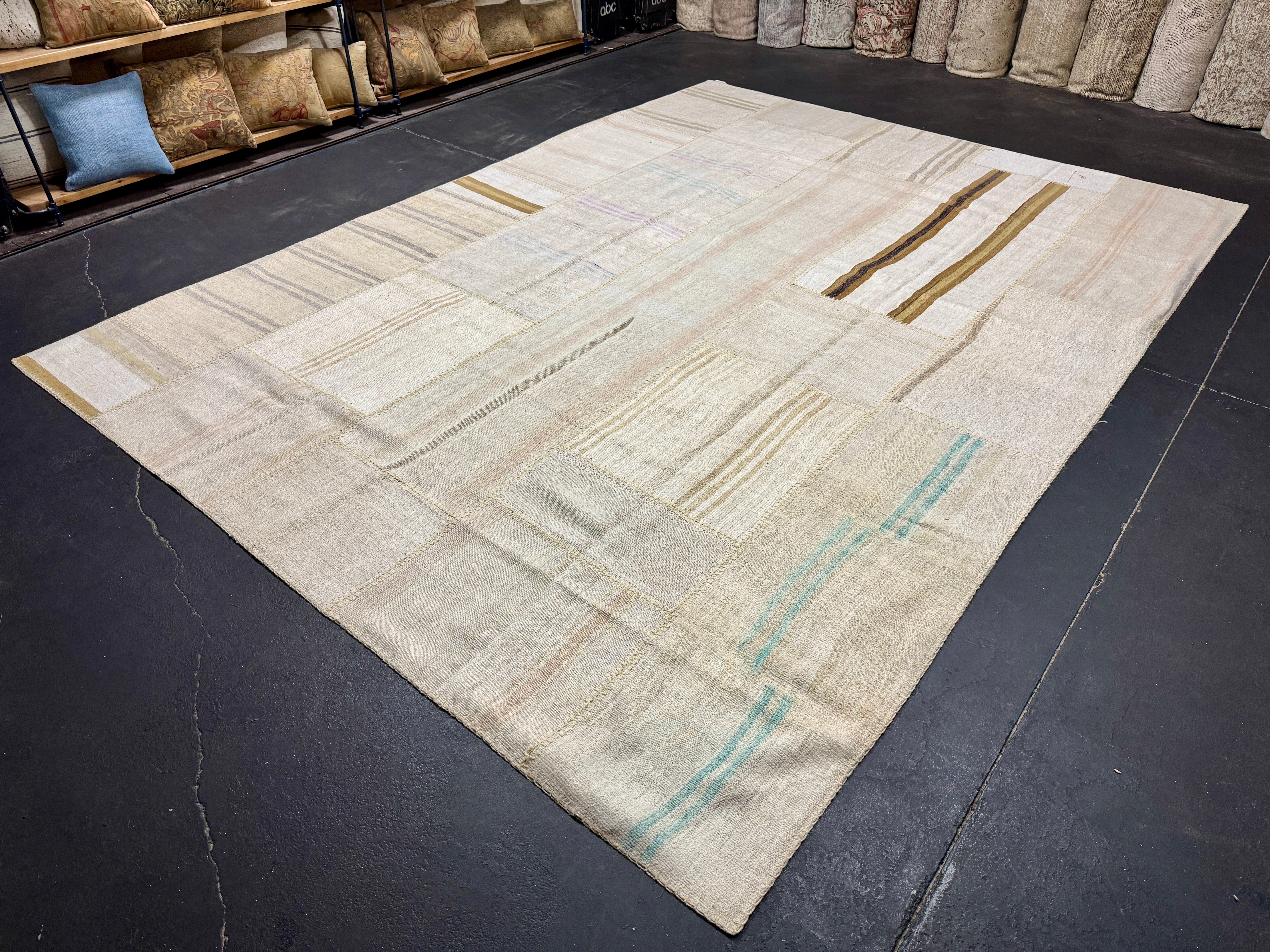 The colors in this collage flatweave are creamy tonal off white with variations in the hemp. There are a few subtle stripes in pretty colors of light blue, taupe, gray, lilac and camel