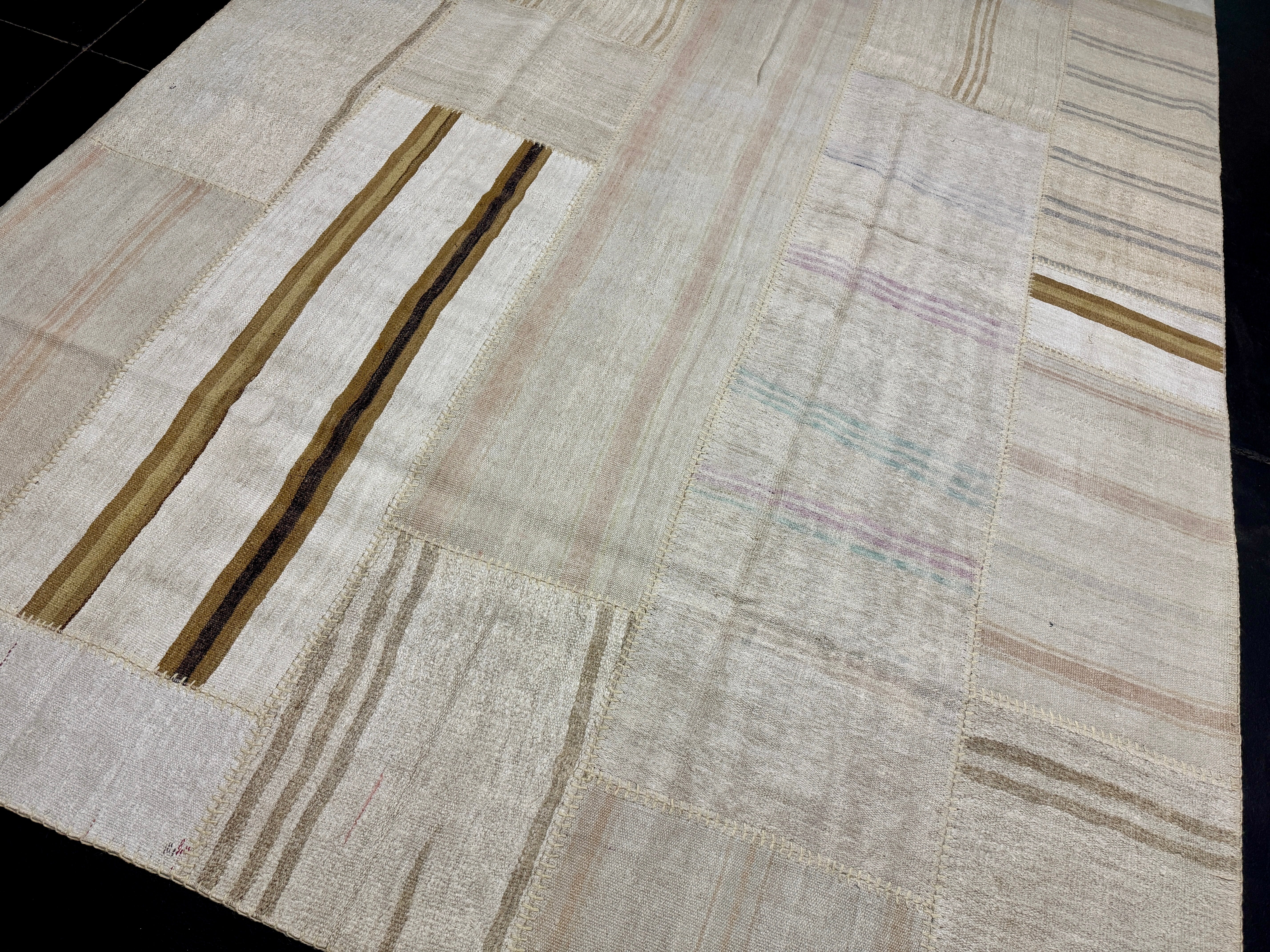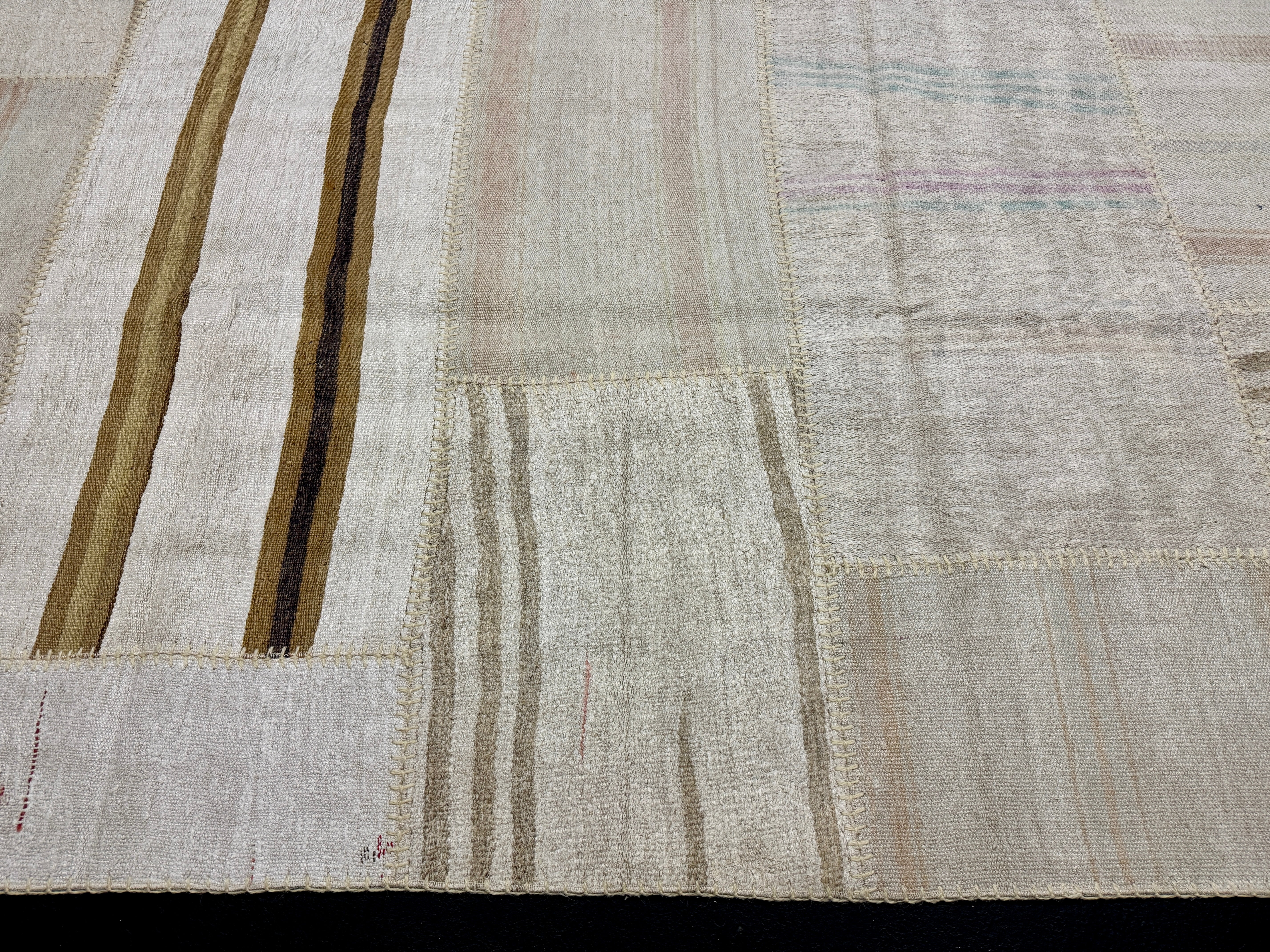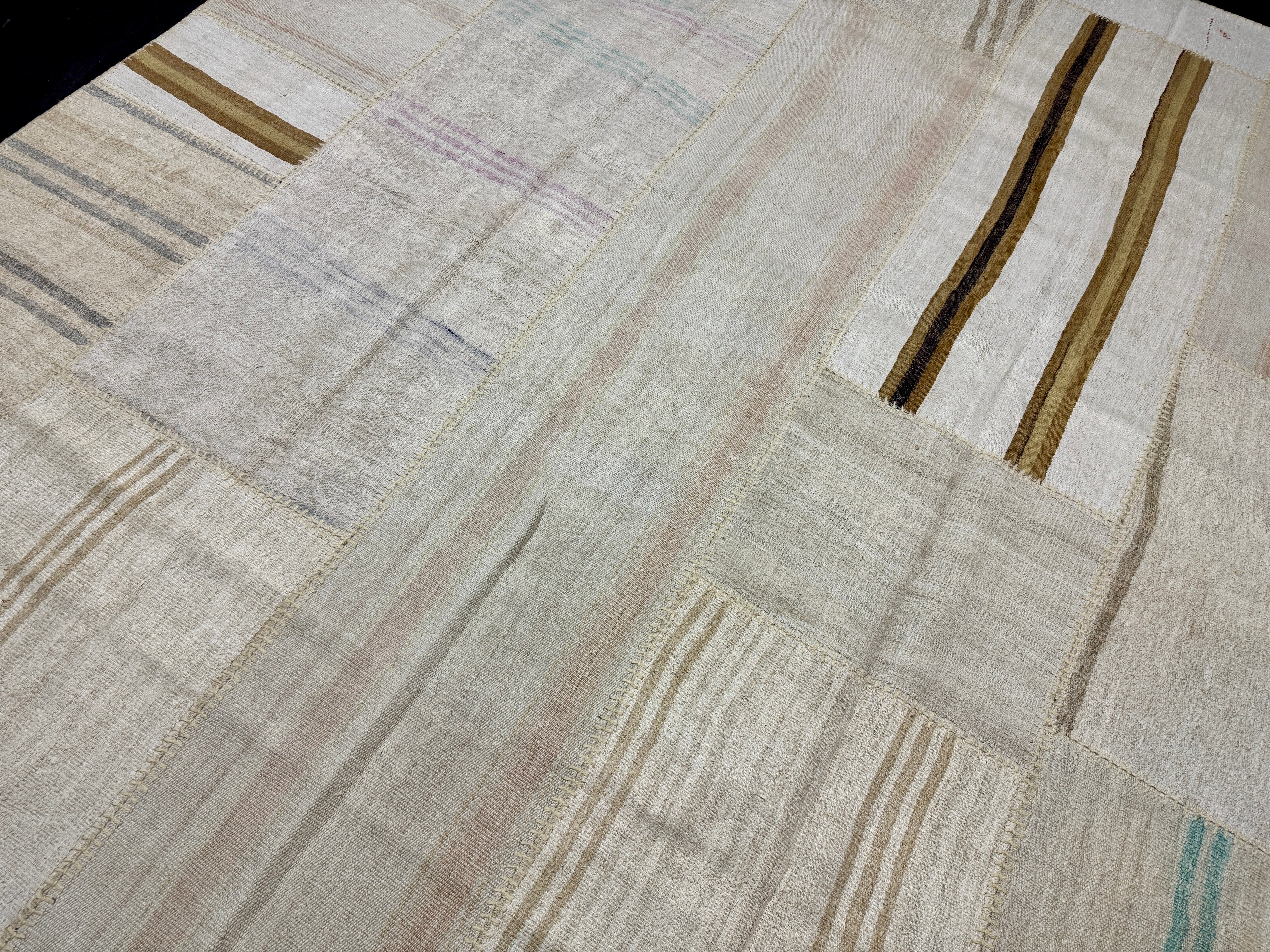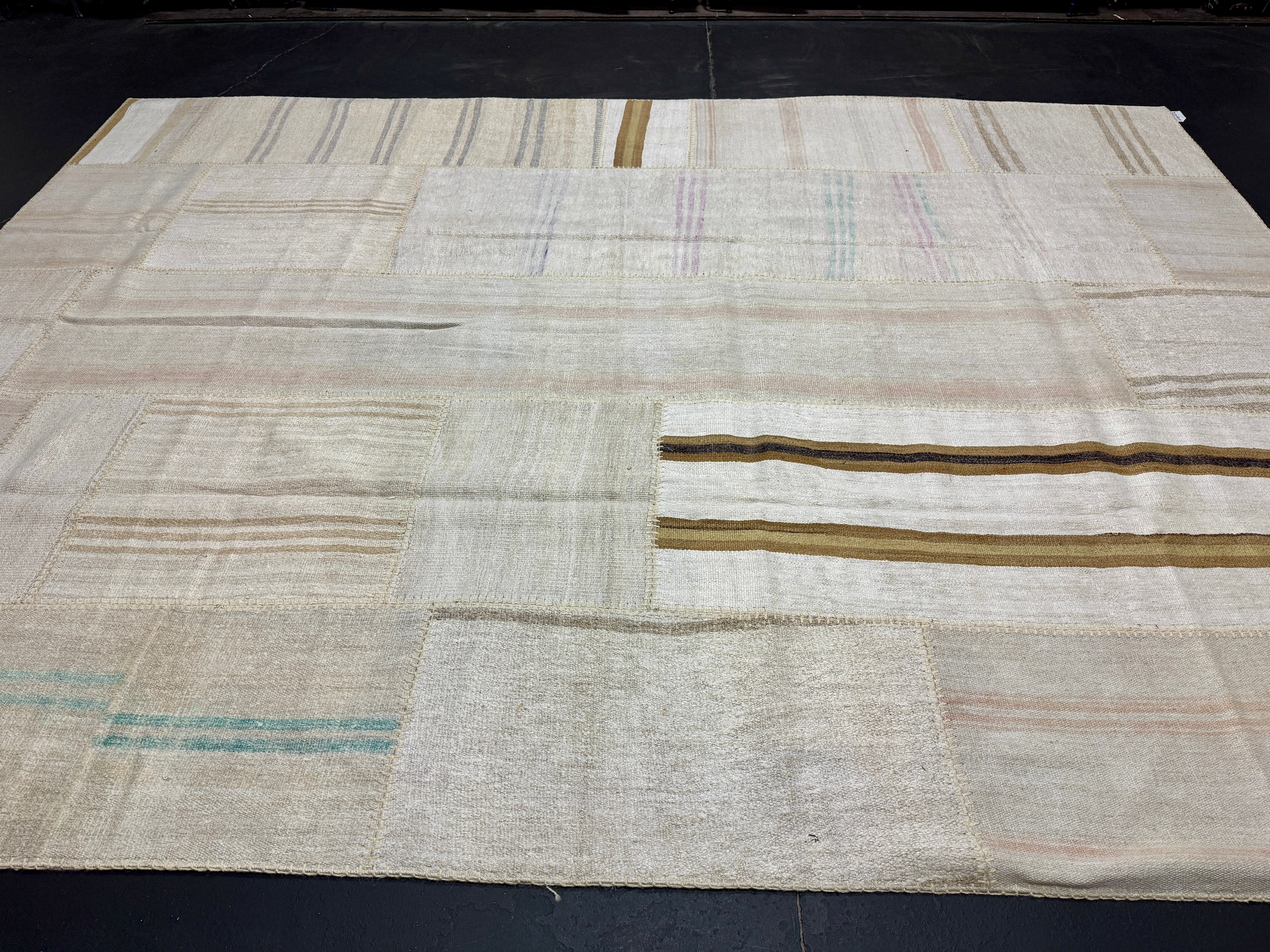The colors in this collage flatweave are creamy tonal off white with variations in the hemp. There are a few subtle stripes in pretty colors of light blue, taupe, gray, lilac and camel