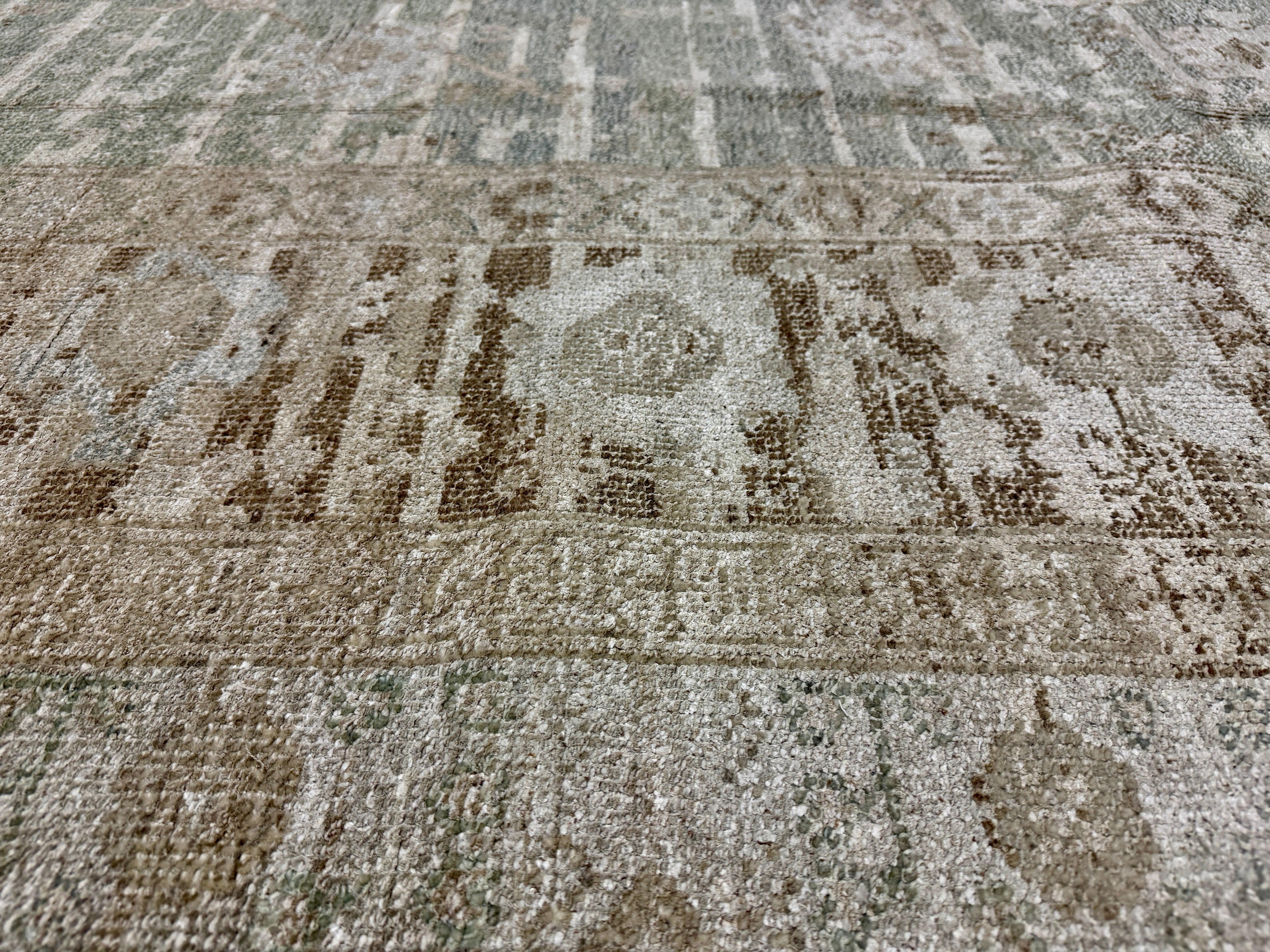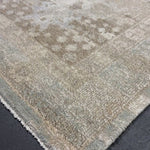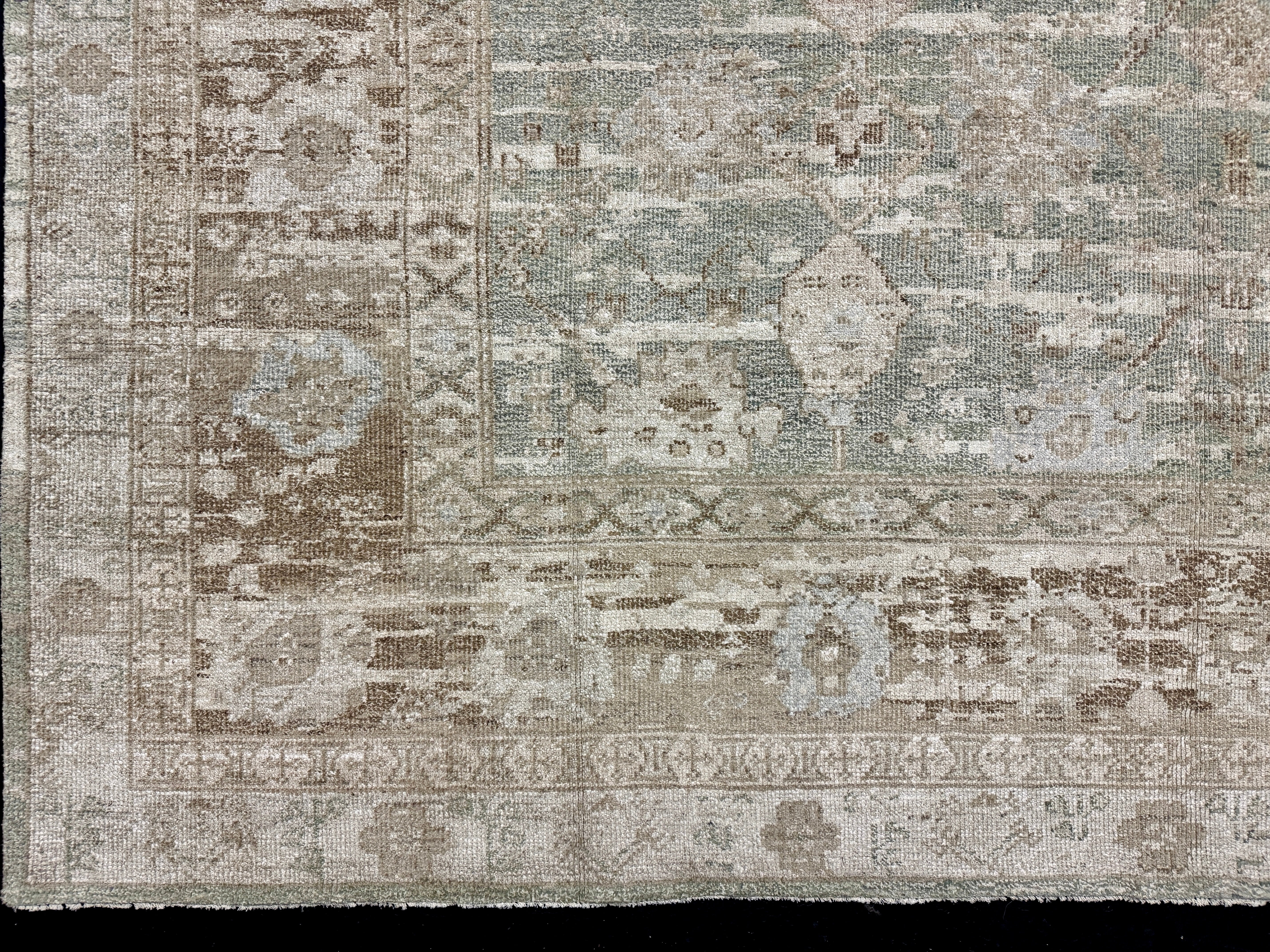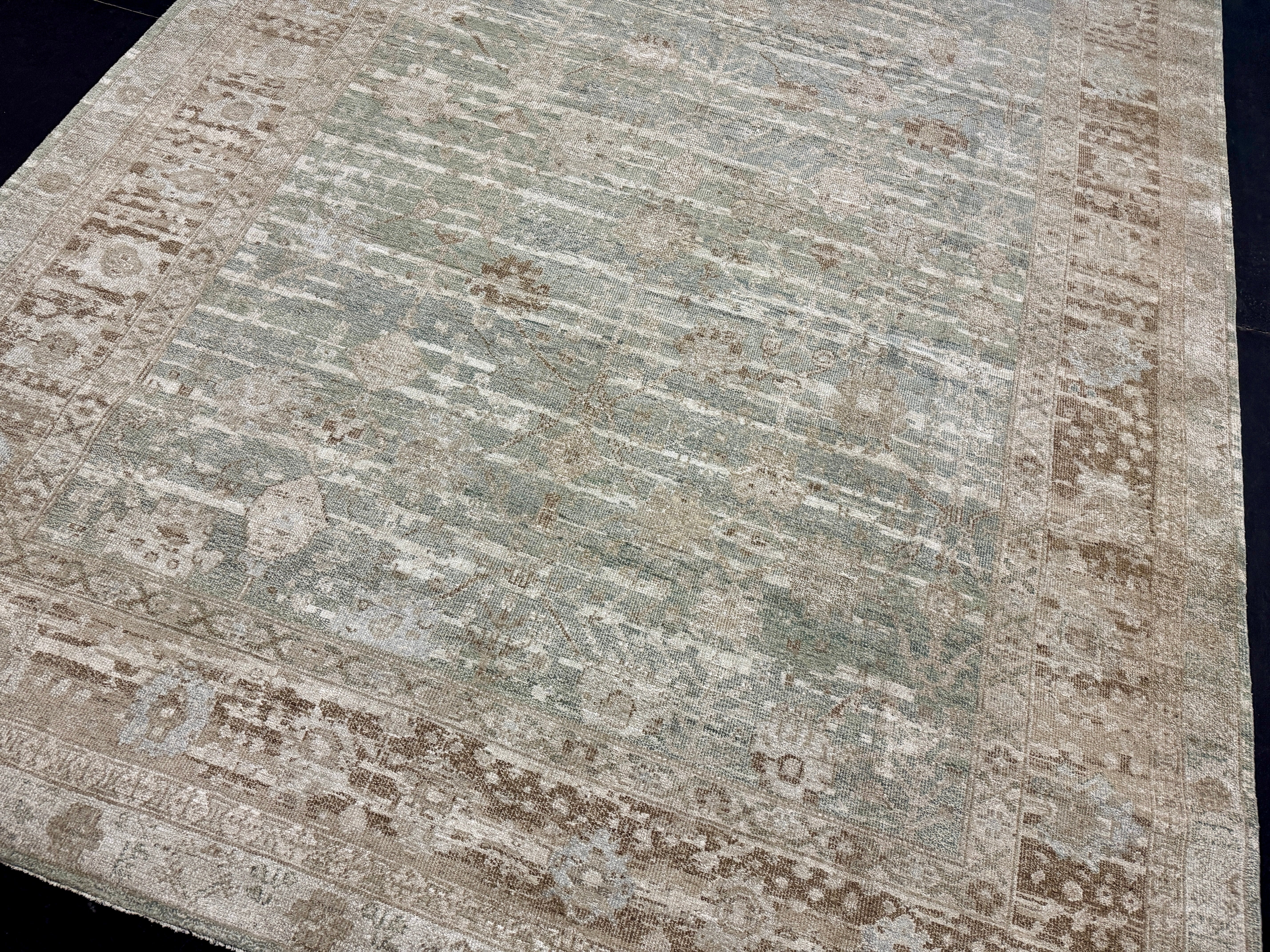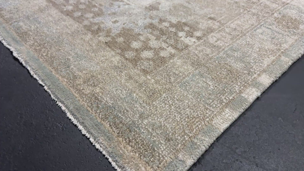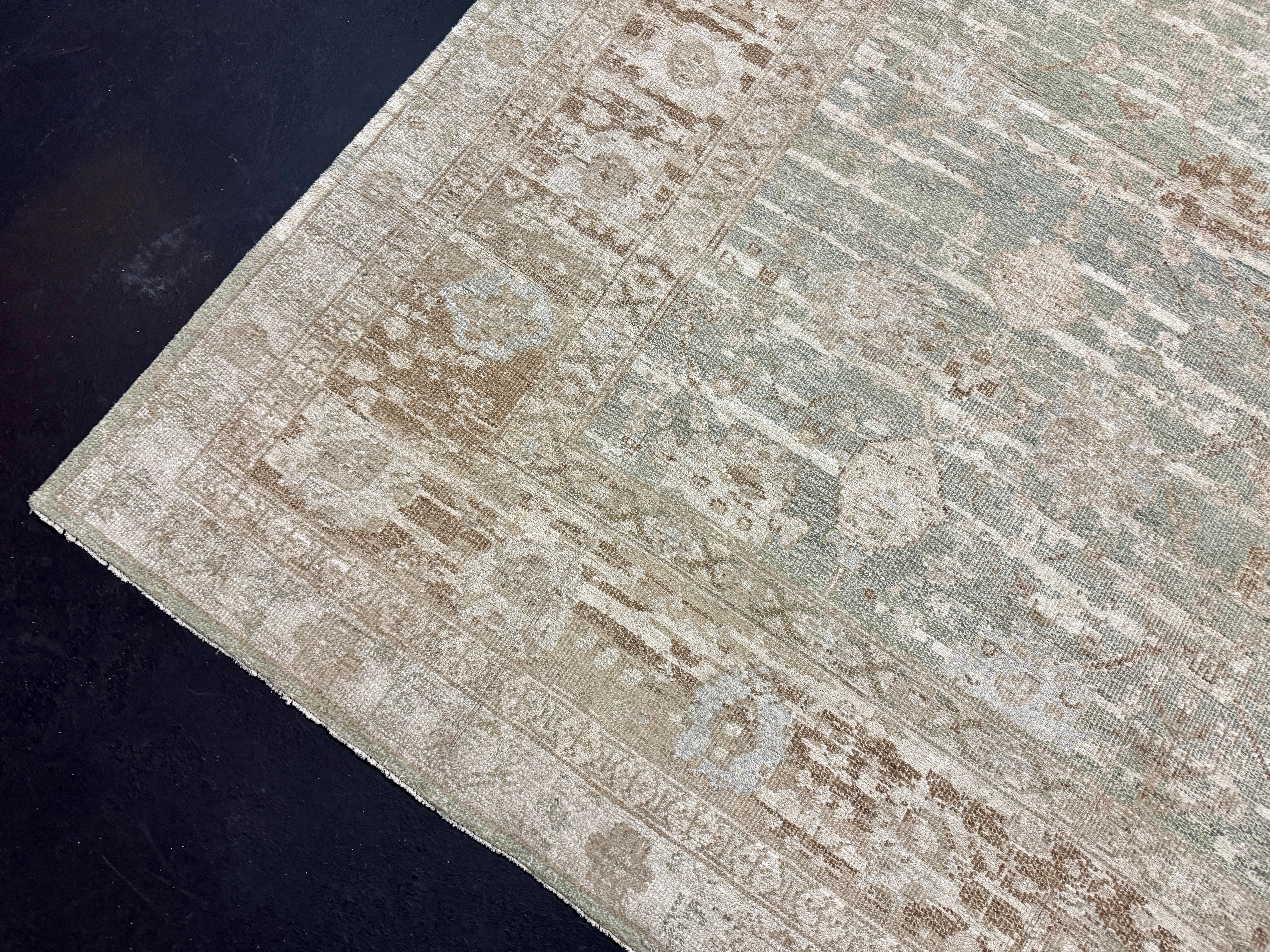 The stonewashing has been a decades long process developed by us at our restoration plant in Oushak Turkey. This stonewashed process gives a subtle sheen to the silk yet gives the appearance and texture and feel of an antique rug. It has been finished by hand washing and blocking