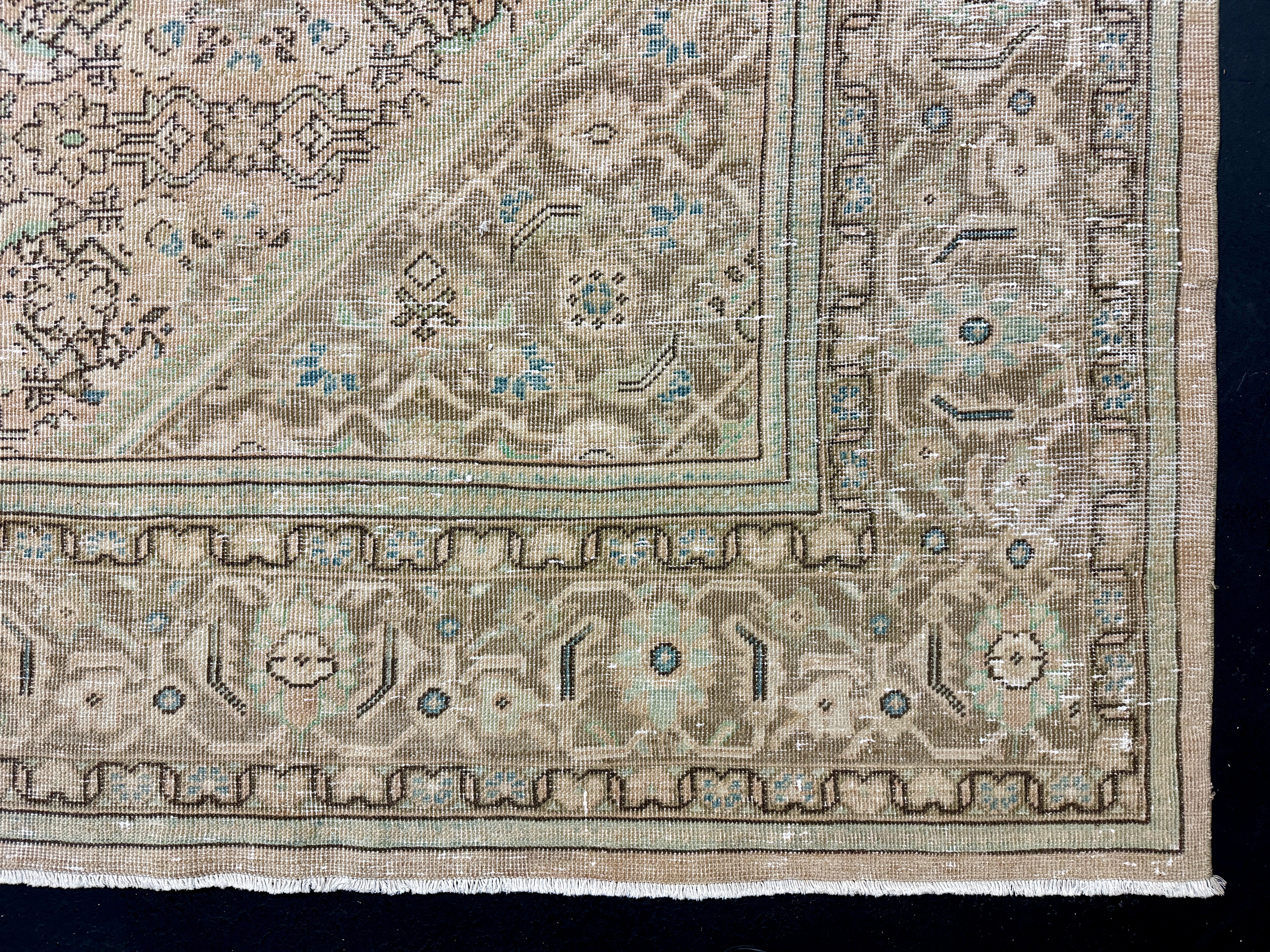 This beautiful low pile piece has its main colors in very muted tawny, very light, brown beige, with denim blue, sea foam green design details with border background having a slight blush hue