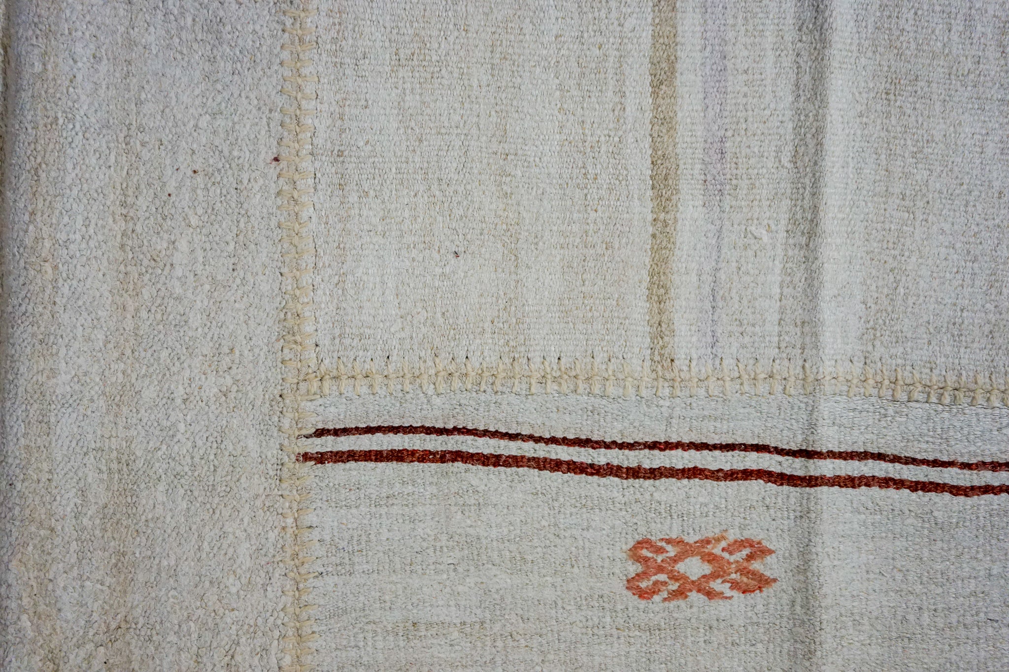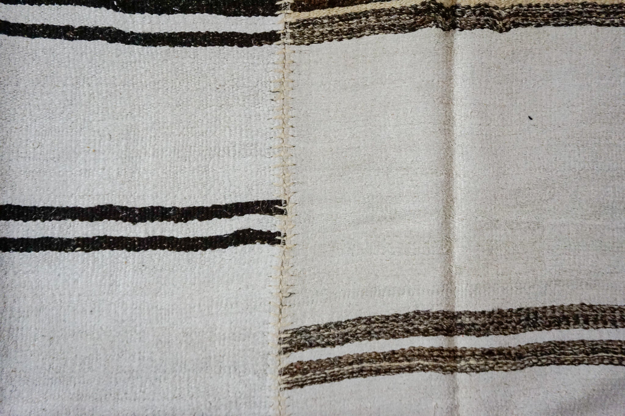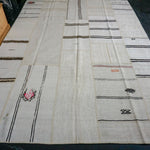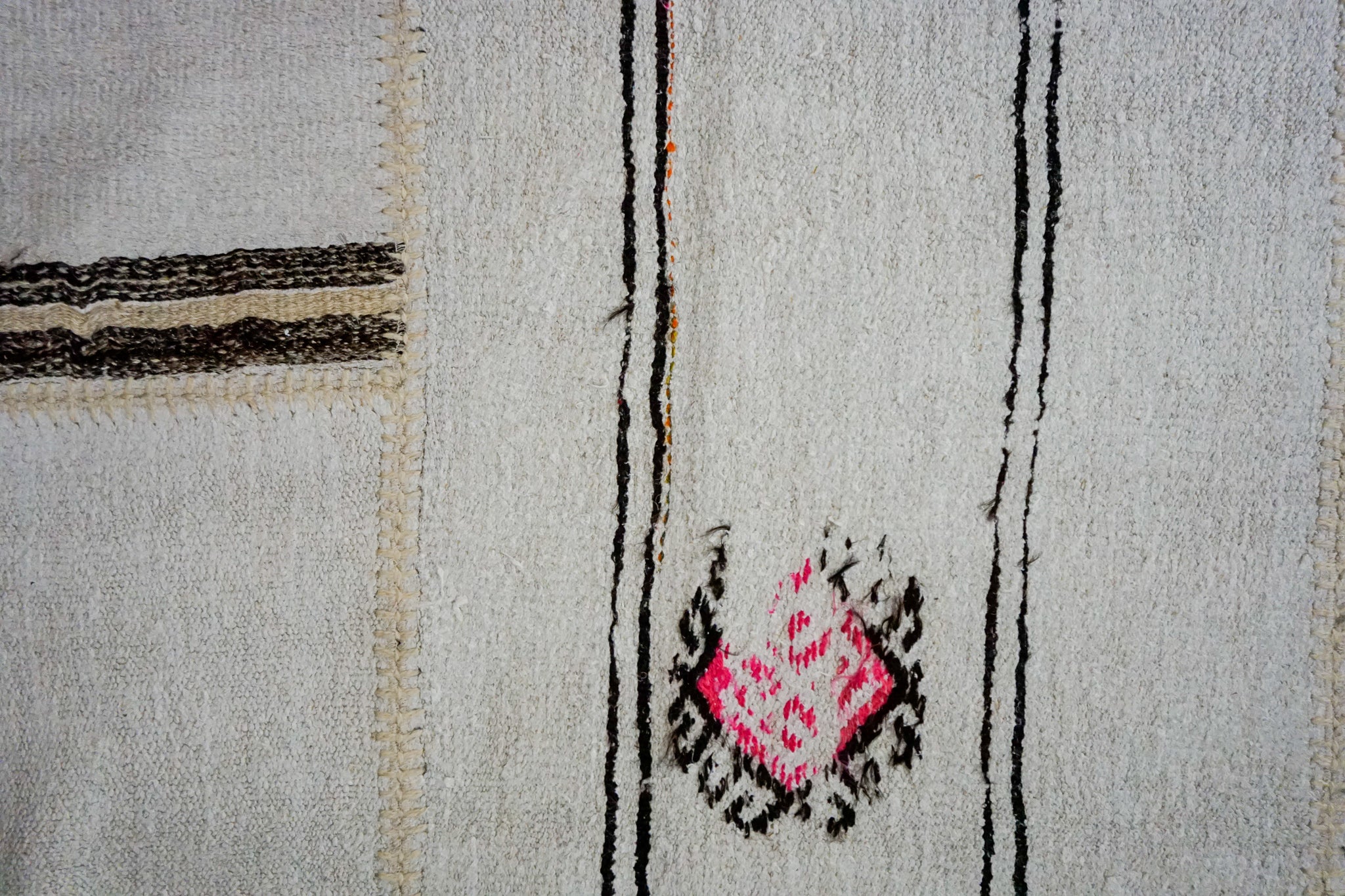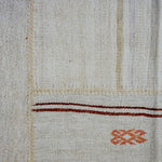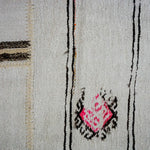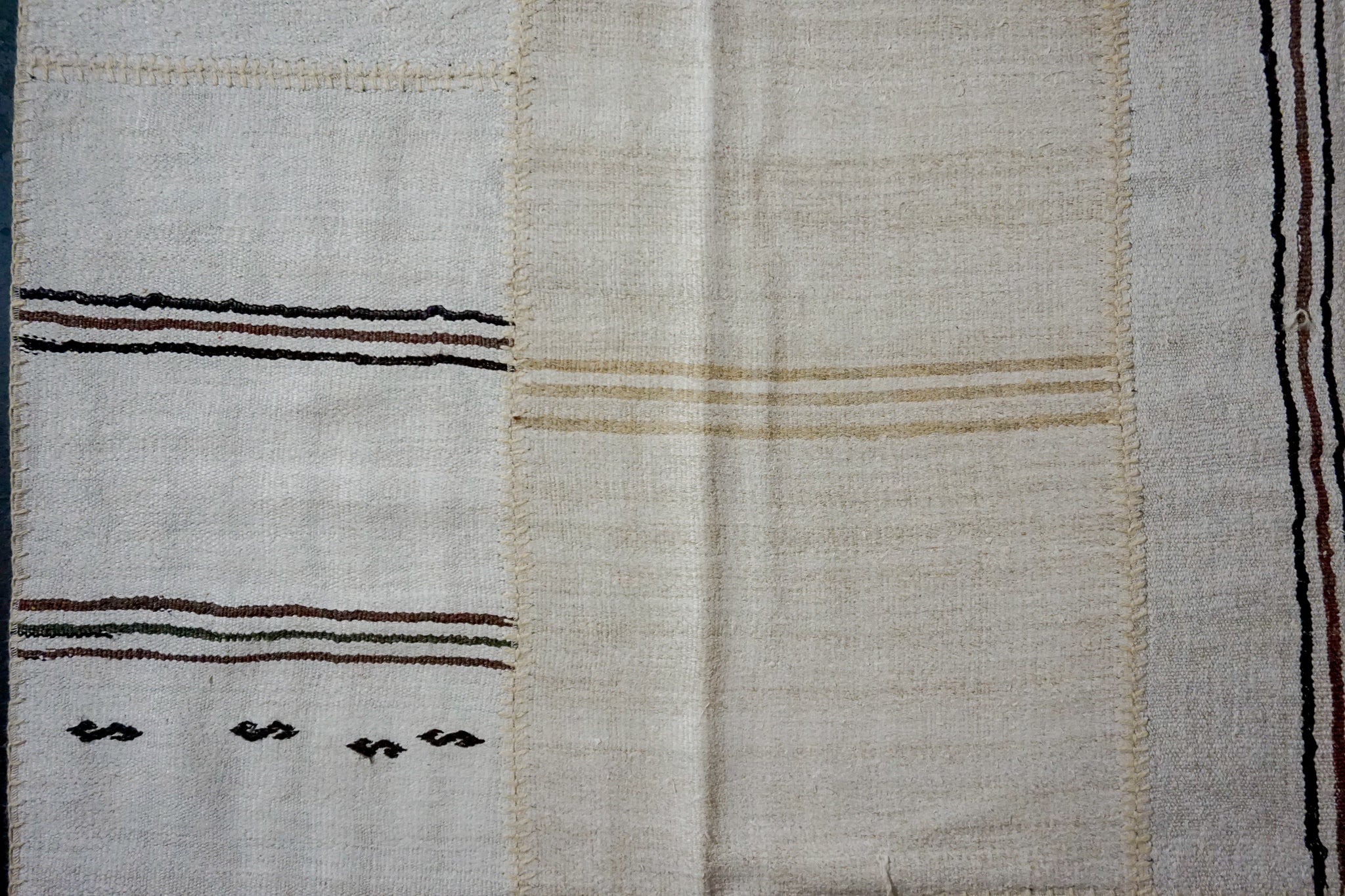The colors in this piece are creamy off white with some variations in the color with dark brown and taupe stripes and a few cicim symbols in pink and wine and coral.